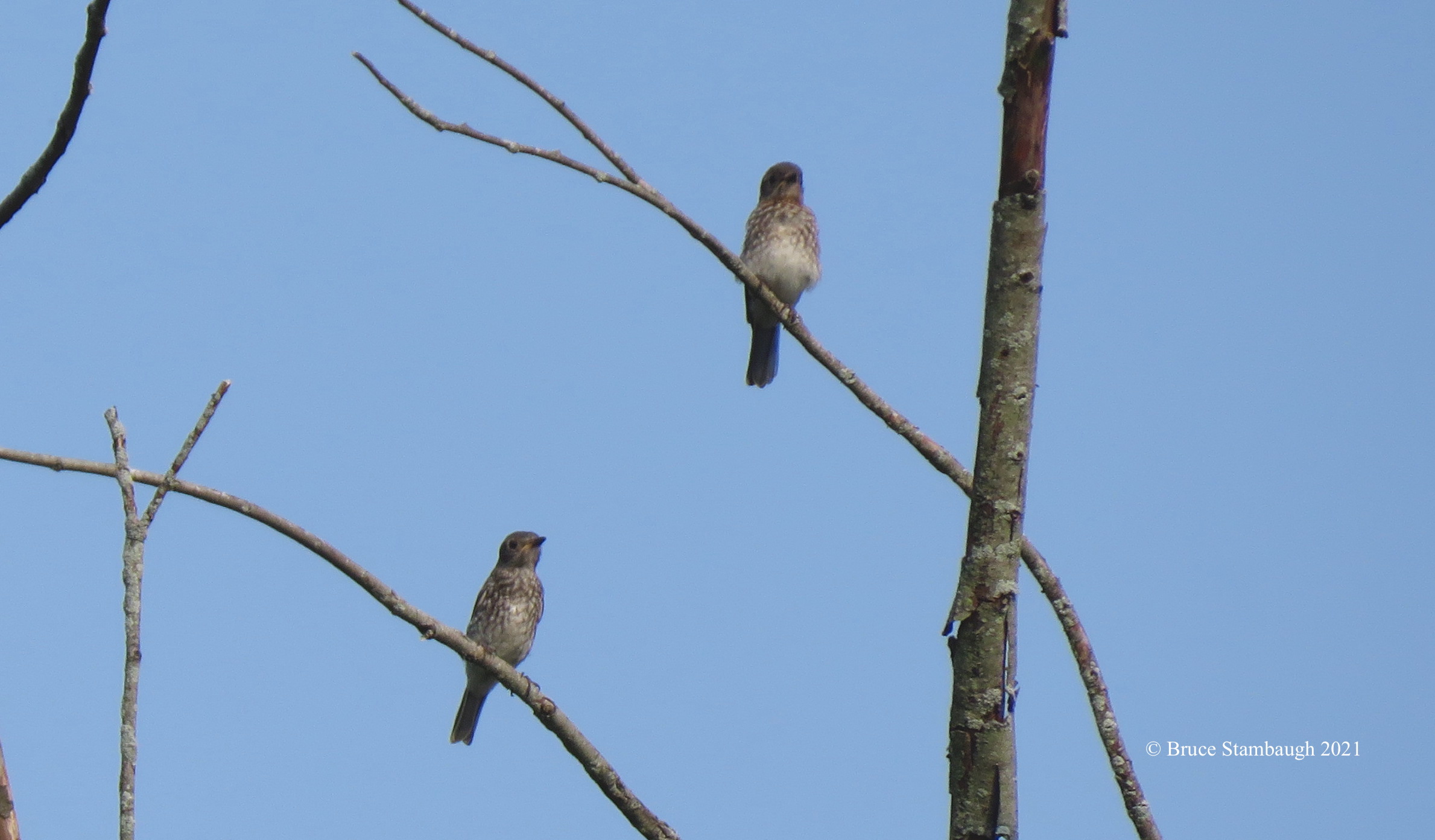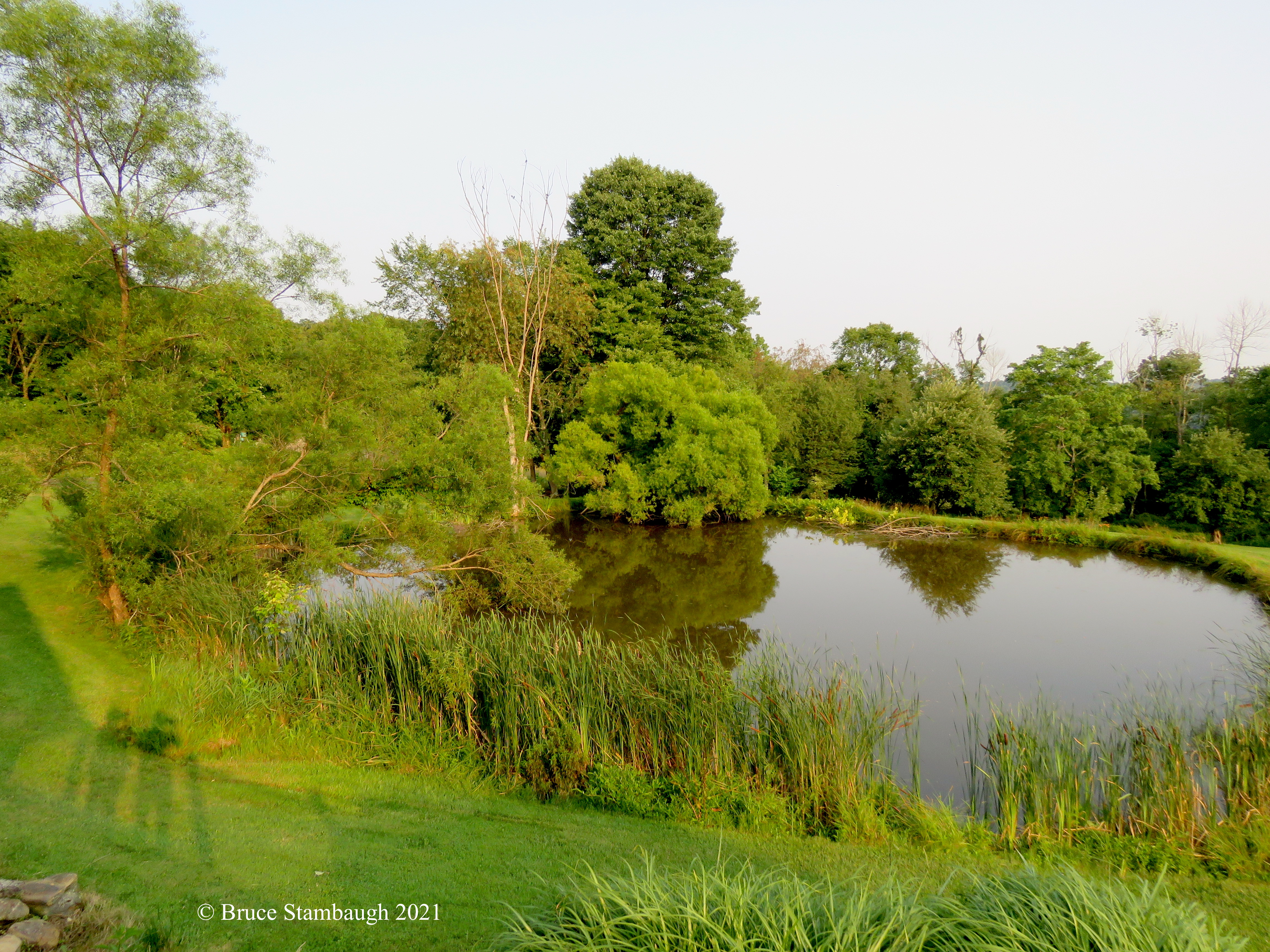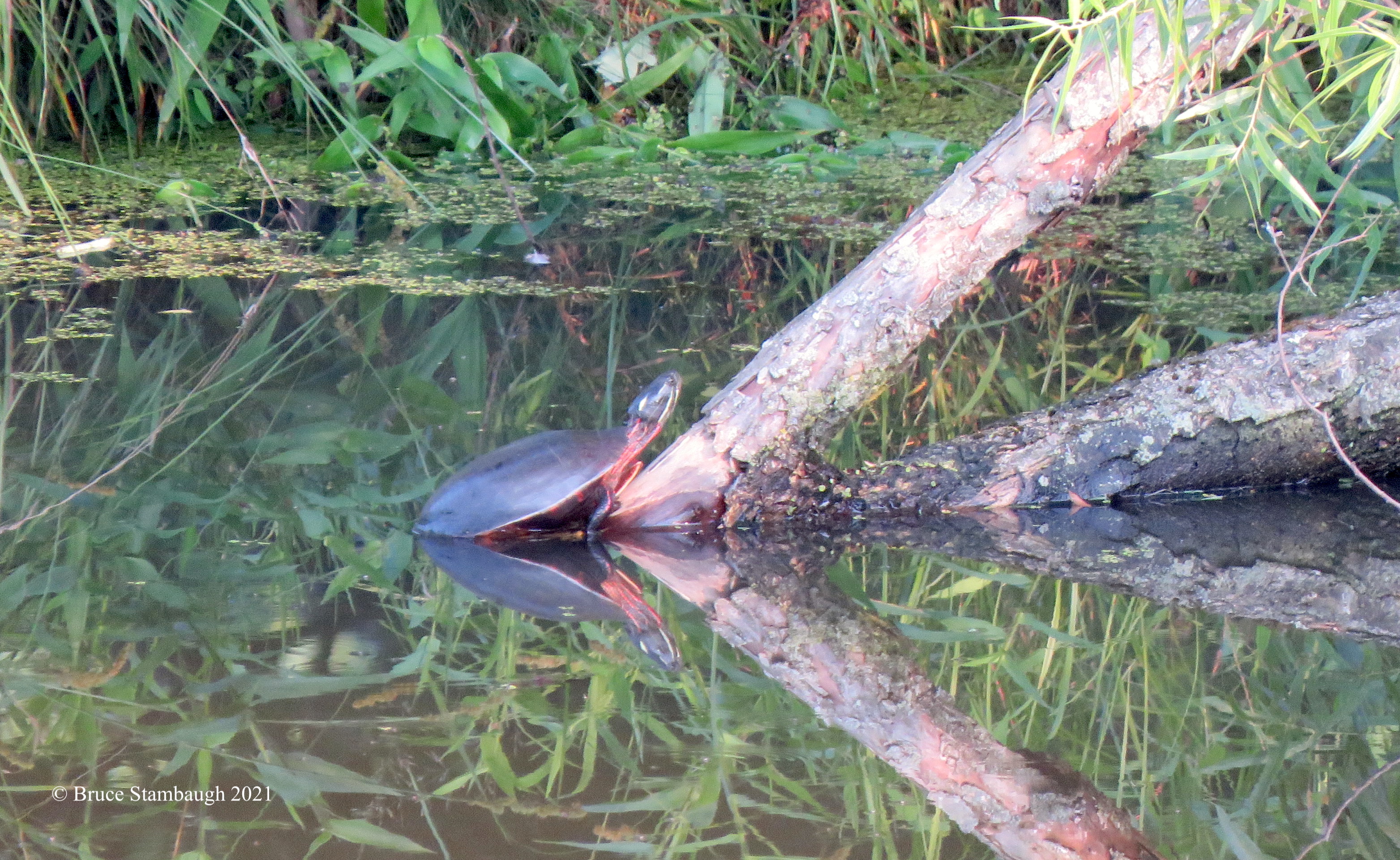 Out on the large porch of the restored cabin, we spotted more than the scarlet tanager. Barn swallows swooped low over a trio of small ponds, skimming the water’s surface for a drink on the fly. A pair of young eastern bluebirds watched the show from perches on a dead ash tree. Painted turtles sunned themselves on an old snag angled into the water.