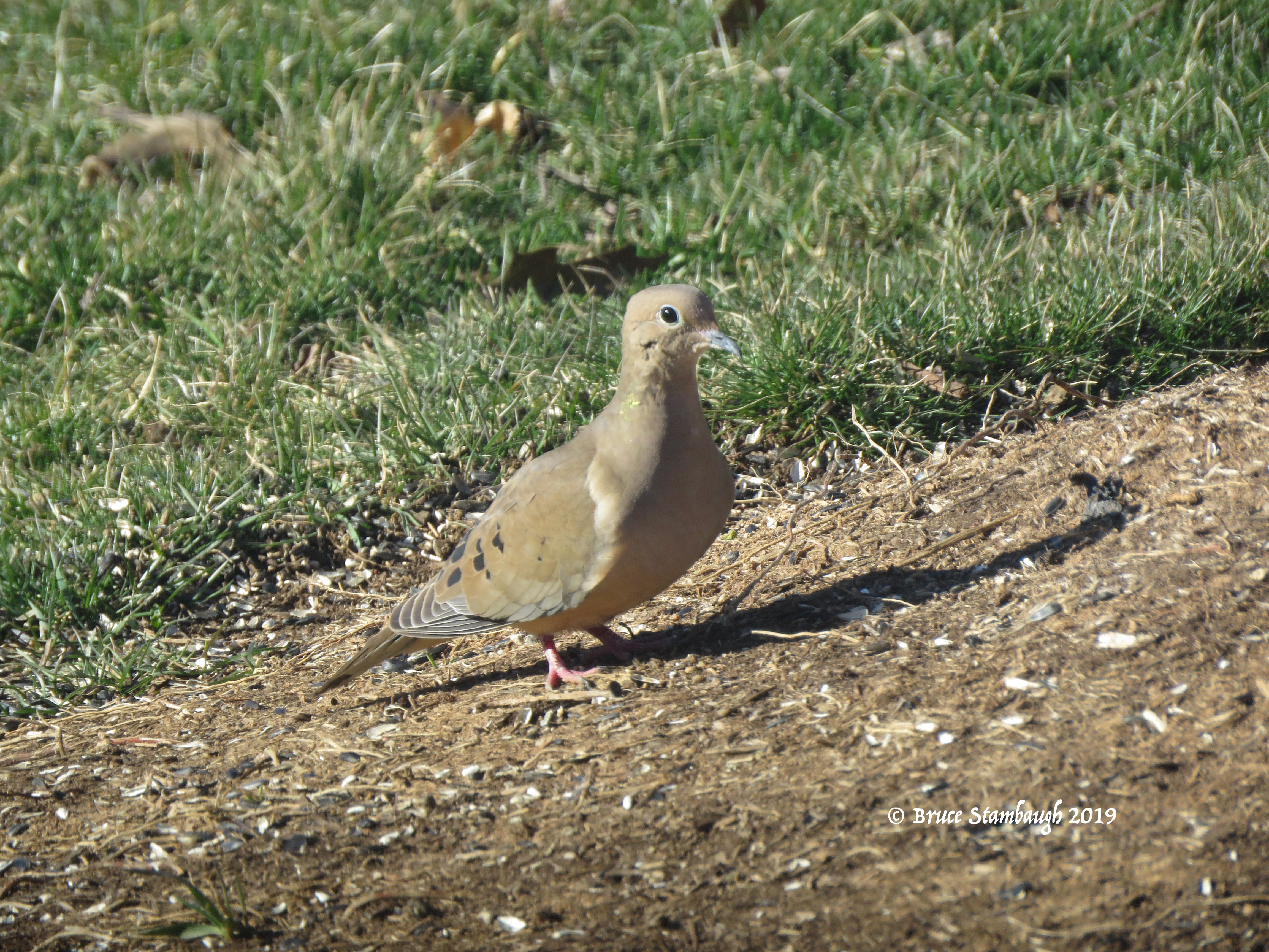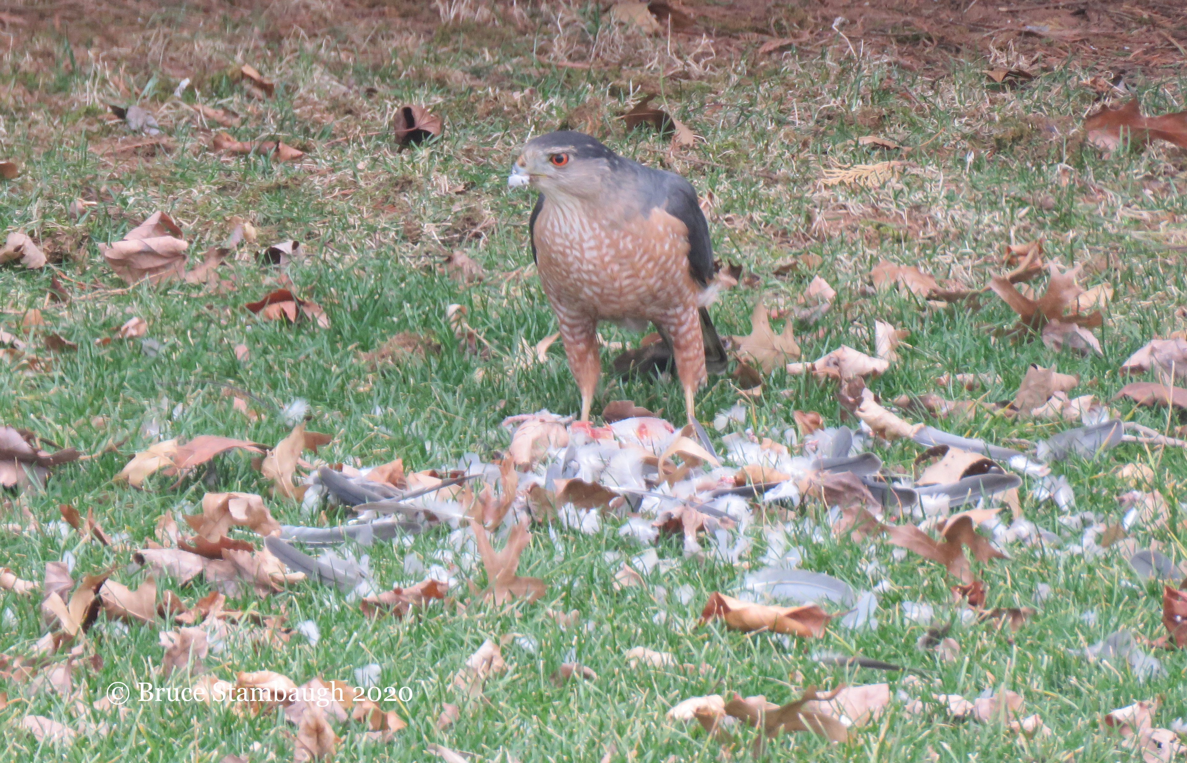 I could see feathers scattered on the ground around the hawk. It had captured one of the mourning doves that come to the feeders or roost in our trees.