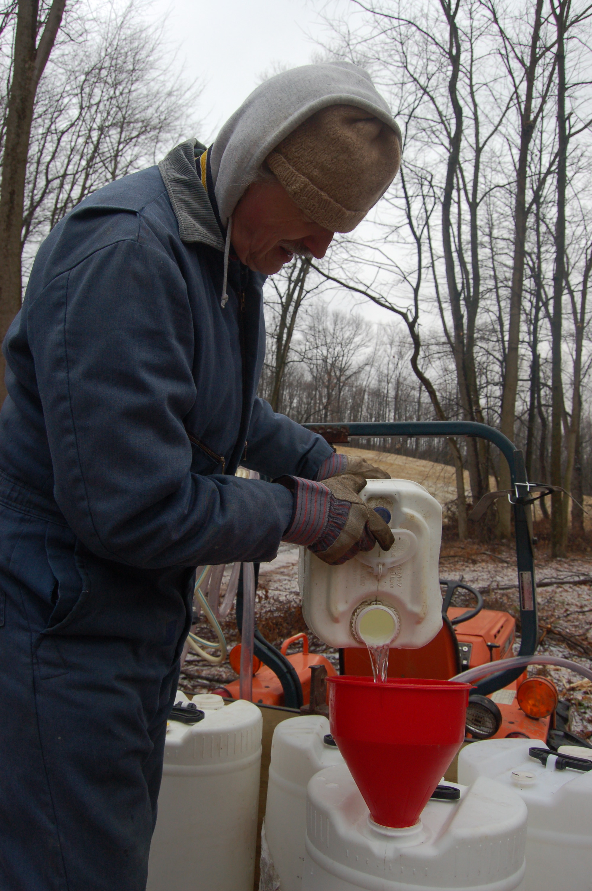 Scott Sponsler poured sap from the collection bucket into a 15-gallon container, which was hauled back with several others to the sugar shack via tractor.Before it is pumped into the elevated holding tank, the sap is gathered into 15-gallon containers from each tap bucket. The containers are carried on the back of a small tractor. In keeping with the pattern, the tractor was loaned, too.