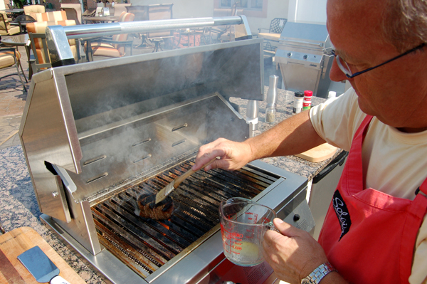 He also uses tongs to turn the meat with ease. A sharp knife, stainless spatula, a brush for basting, a timer and an apron are always at his ready, too.