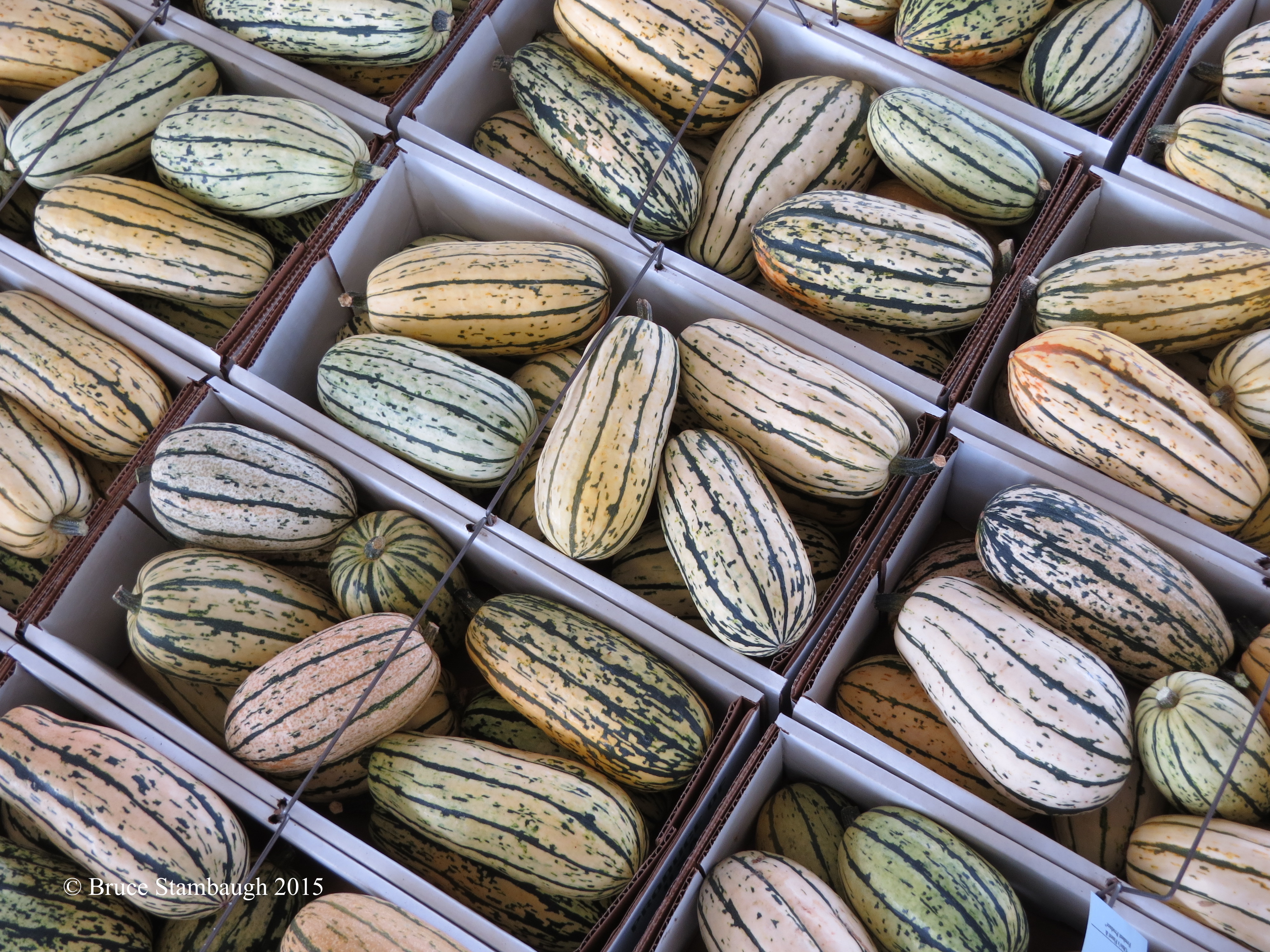 Living in the country all of my adult life, I like to think that I know vegetables. When I came upon these beauties, I had to ask what they were. The Amish woman said they were Delicate Squash. Given their intricate and varied variegated coloration, I could see why they got that name. However, when I saw the same squash being sold at the Farmers Produce Auction near Mt. Hope, Ohio, I checked the tag for the name. It read, “Delicata Squash.”