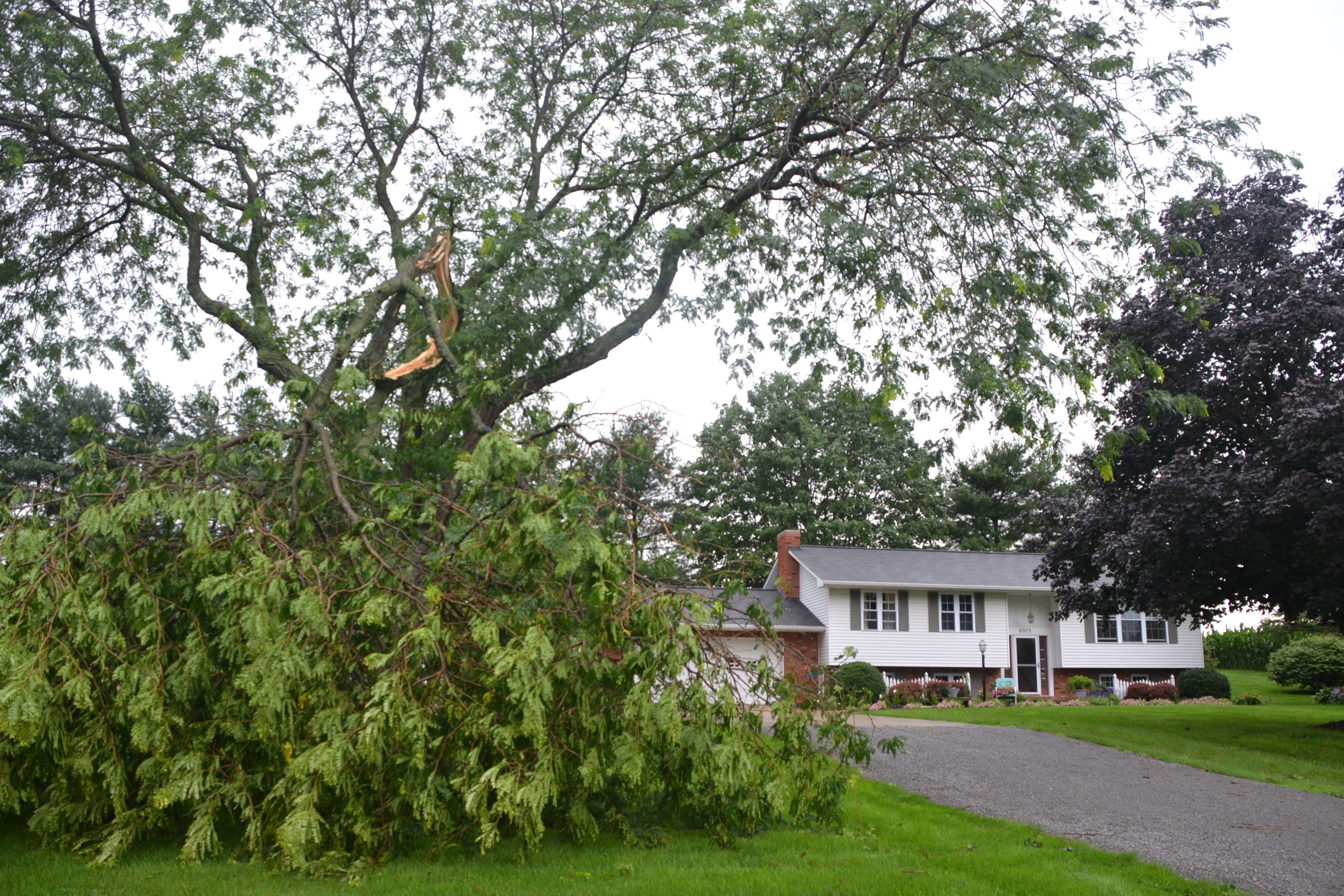 Whipping winds from a severe thunderstorm damaged a substantial limb in the middle of the sunburst locust tree in our front lawn.