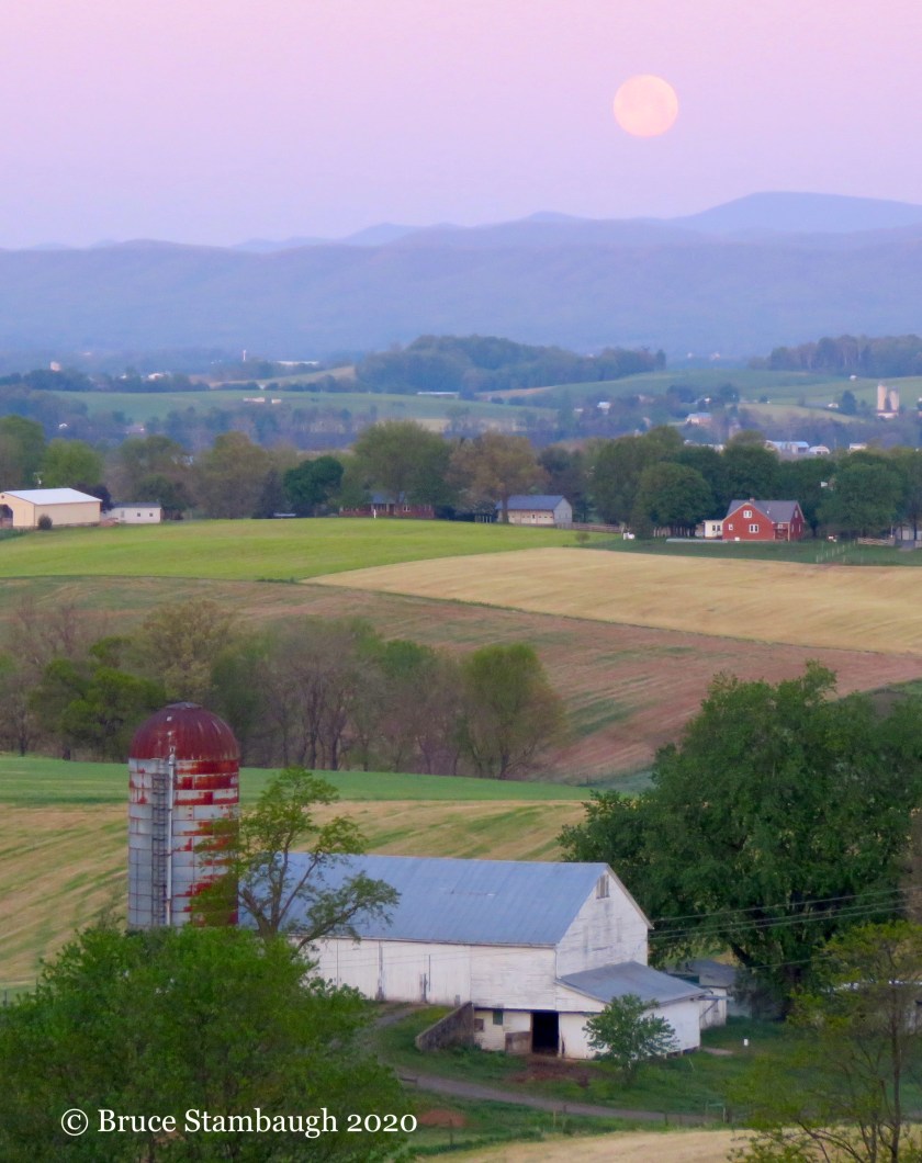I had a clear view of the moon from Mole Hill, an ancient volcano, and noted area landmark west of Harrisonburg. Dawn’s early light highlighted Old Order Mennonite farms that dot the landscape all the way to the Allegheny foothills. The rusty silo, the brick farmhouse, the rolling, fertile fields, and the sweeping mountain slopes all take your eye right to the setting moon.