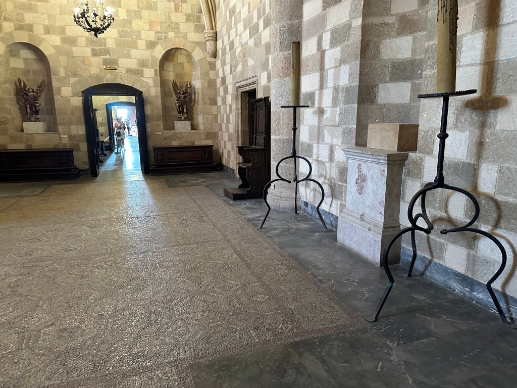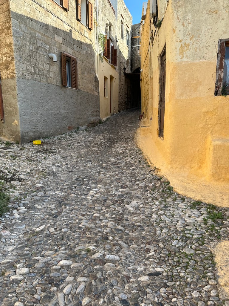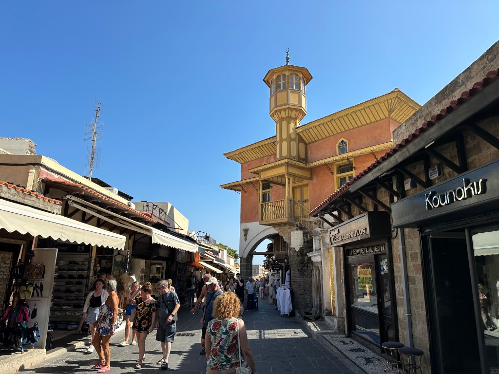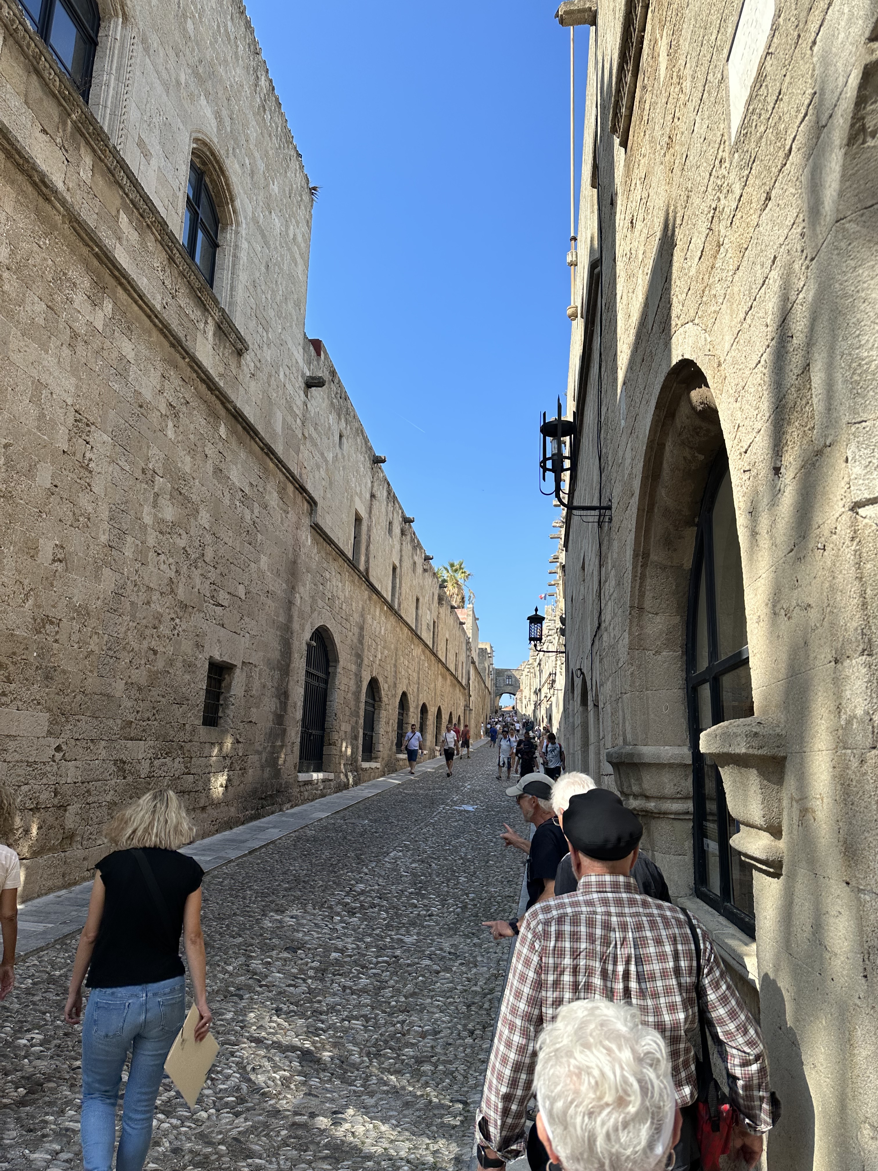 We marched up the steep incline of the Avenue of the Knights, with its pebbled cobblestones, to the Palace of the Grand Master. The Old Town owes its present-day appearance mainly to the Knights of St. John from the 14th and 15th centuries AD. The Knights closely followed the city’s Hippodamean grid plan, and sometimes, some streets follow the exact route of the 5th century BC streets. The main street today, Sokratous Street, was also the main commercial street in the Hellenistic period.