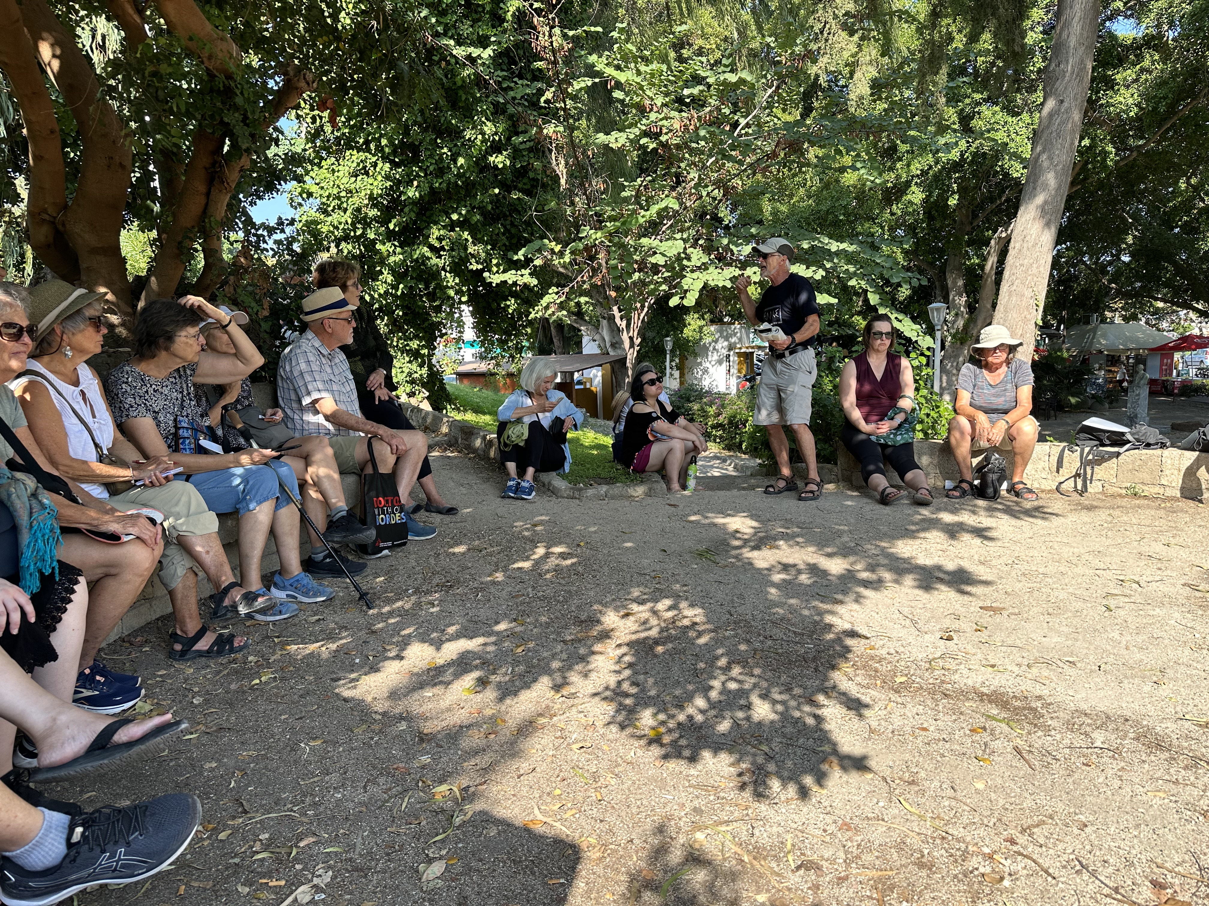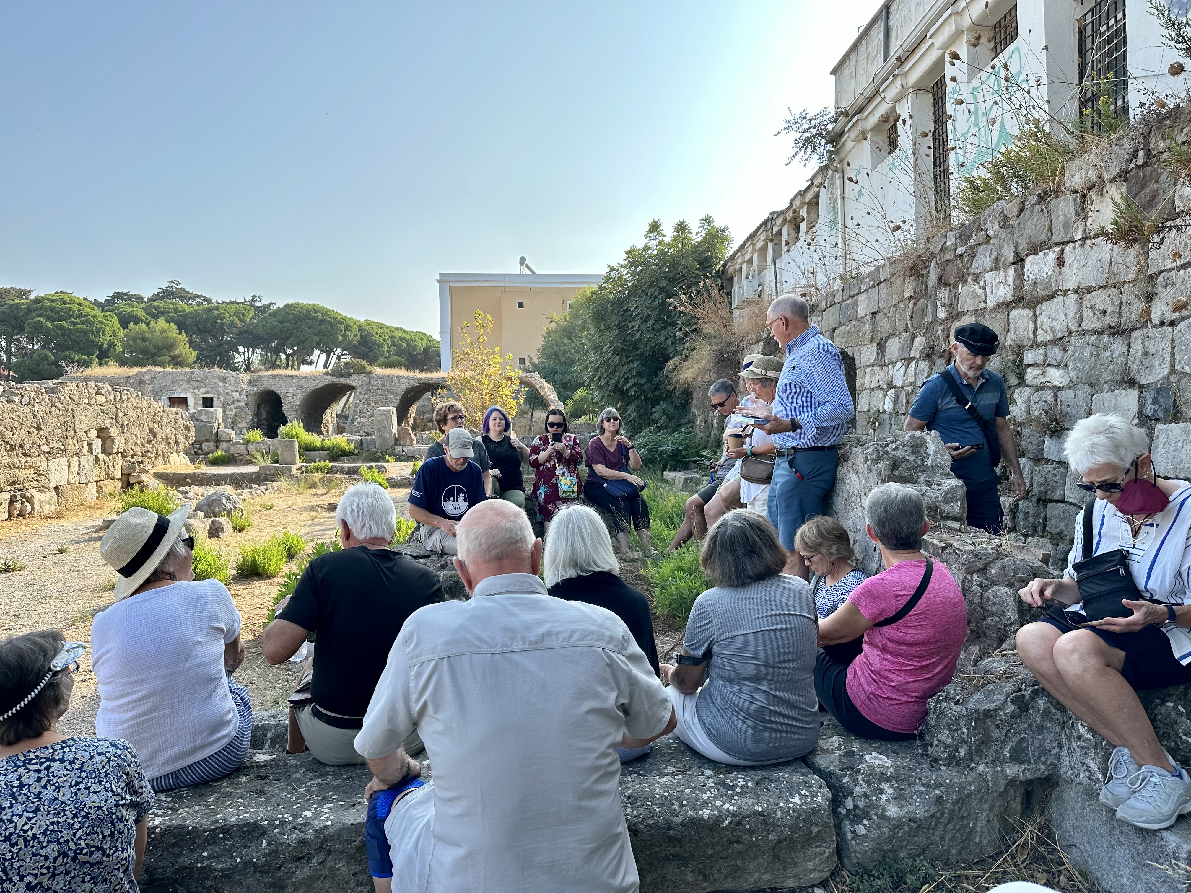We headed outside the wall along the harbor’s edge to St. Paul’s Gate. On the way, we saw a section of the now-dry moat surrounding the Old City. Beneath the shade of a large tree, Linford focused on the importance of Rhodes during the Crusades. Because of its strategic location in the southern Aegean, Rhodes was an important trading city and a desired military location.