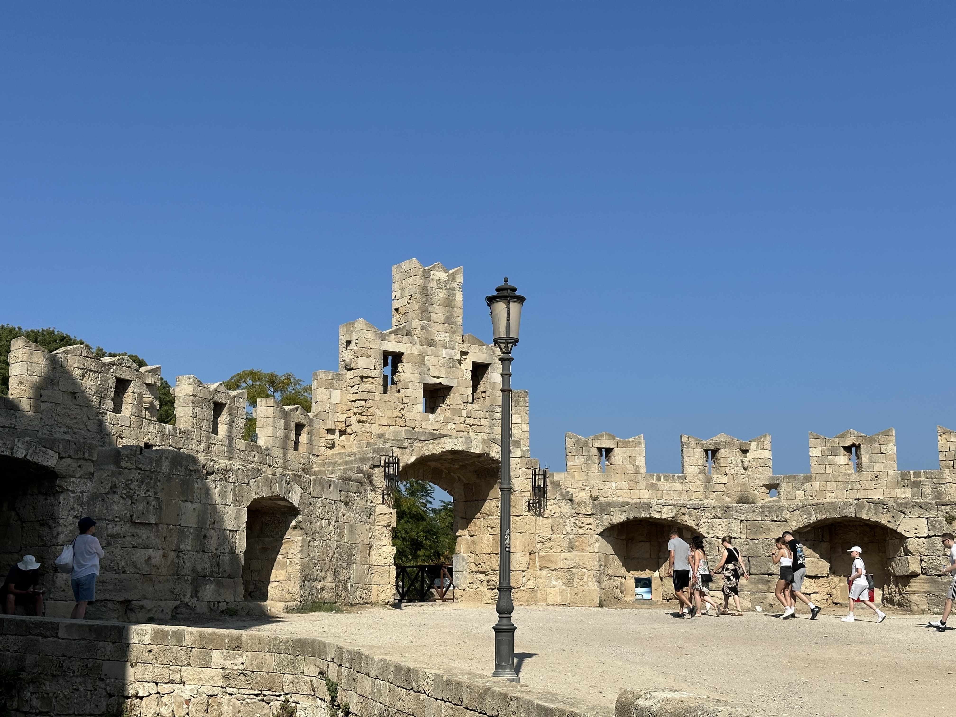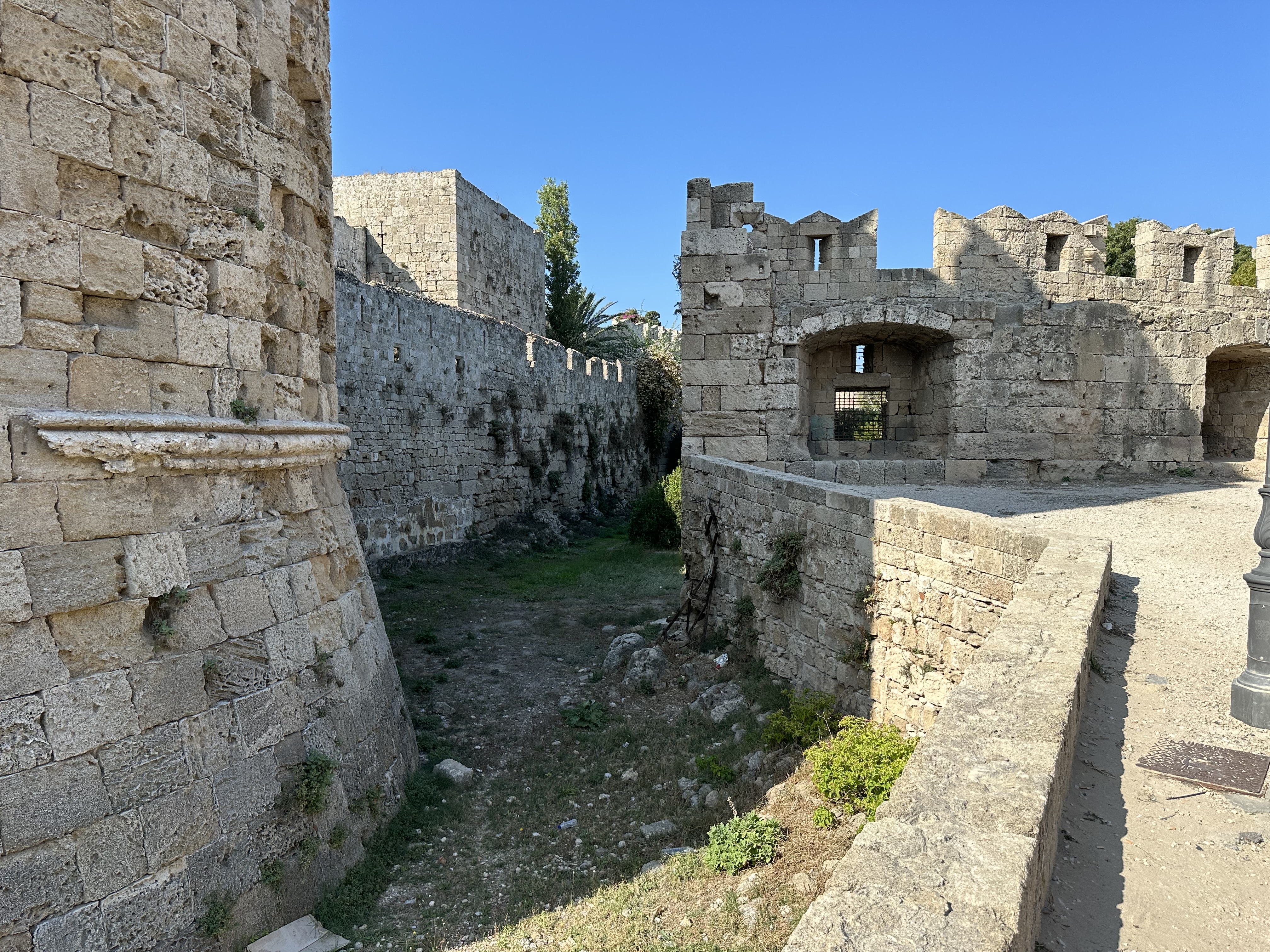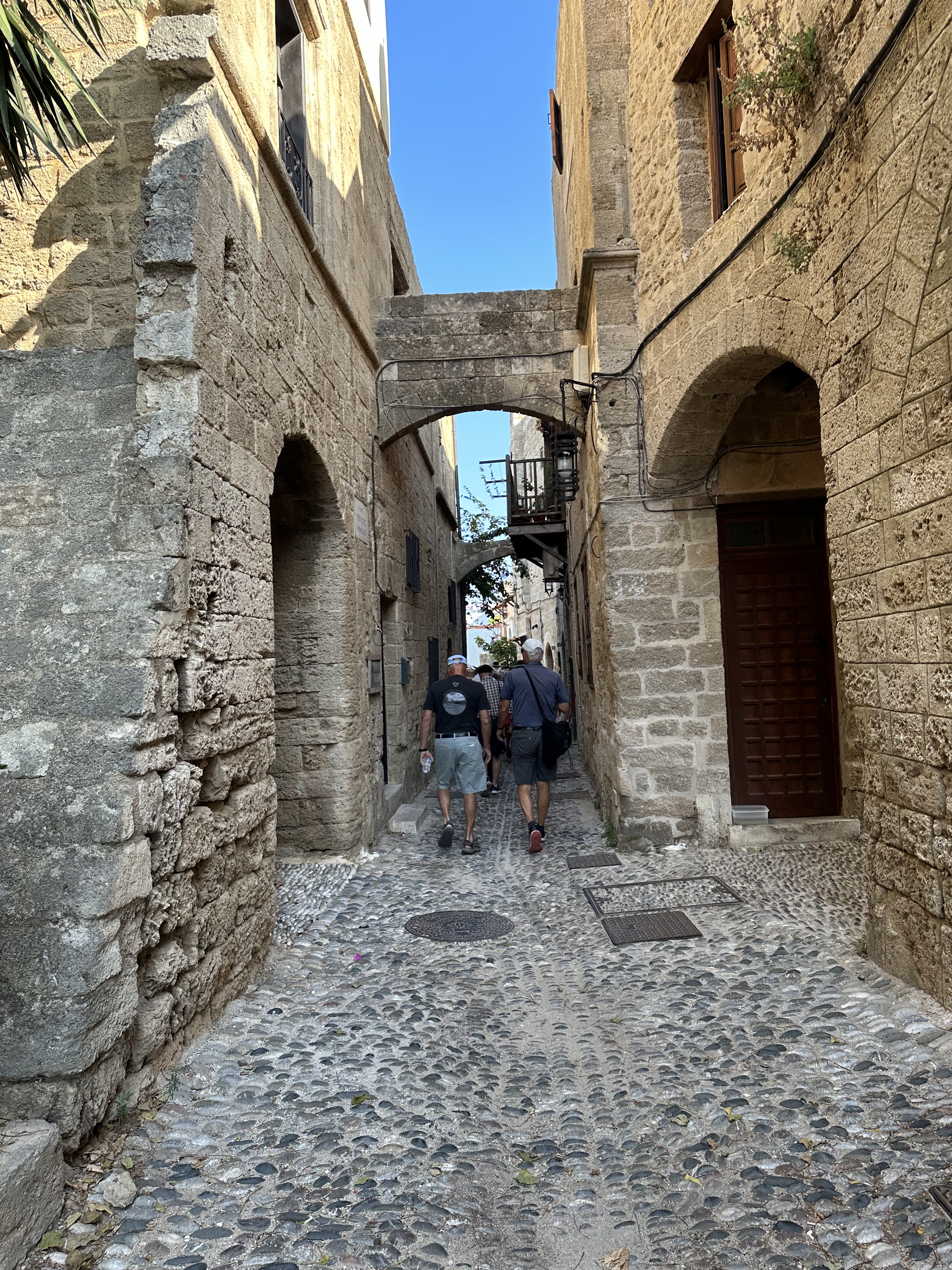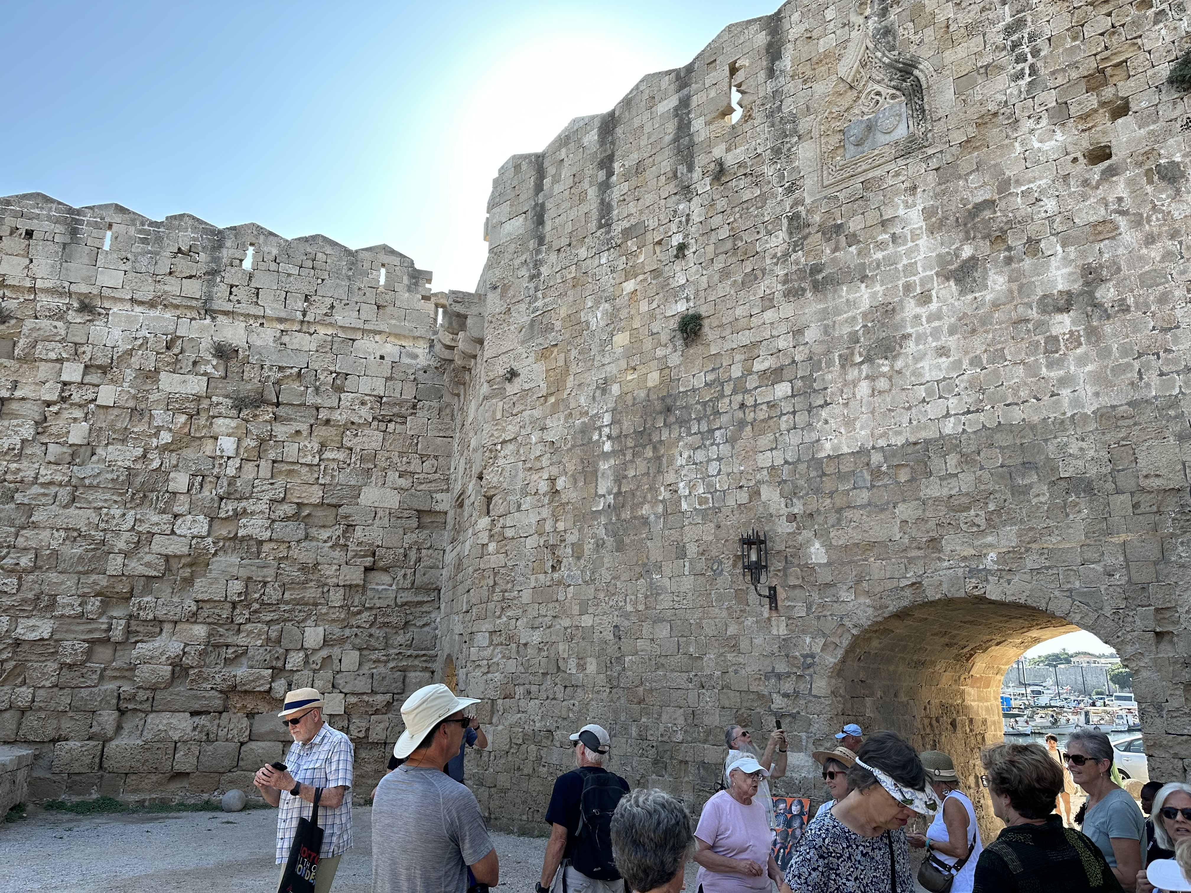 We landed in Rhodes well after dark. We hauled our luggage off the ferry, along the Old City wall, through an ancient gate, and along the inside of the wall to our hotel. The medieval city is a UNESCO World Heritage site.