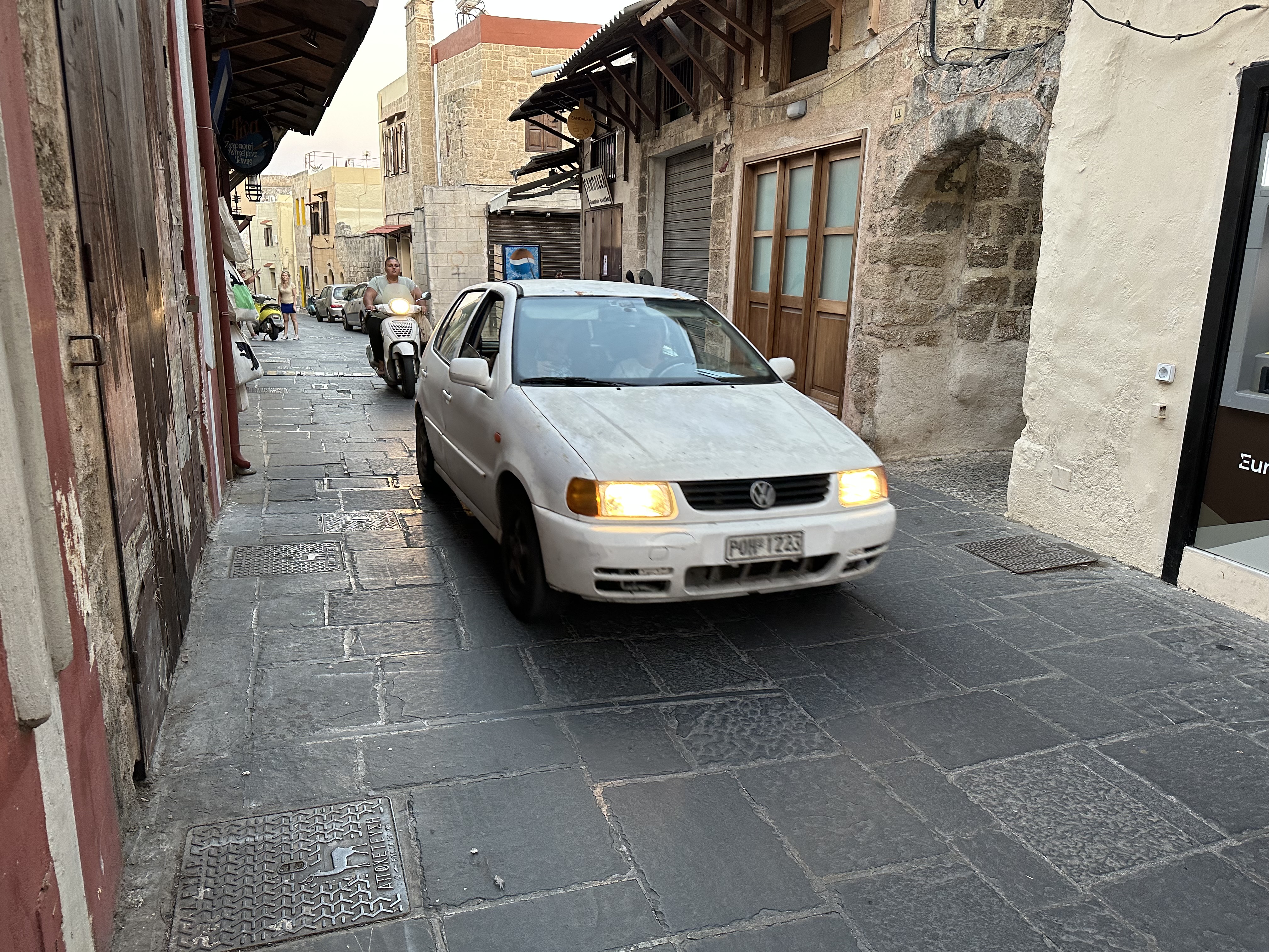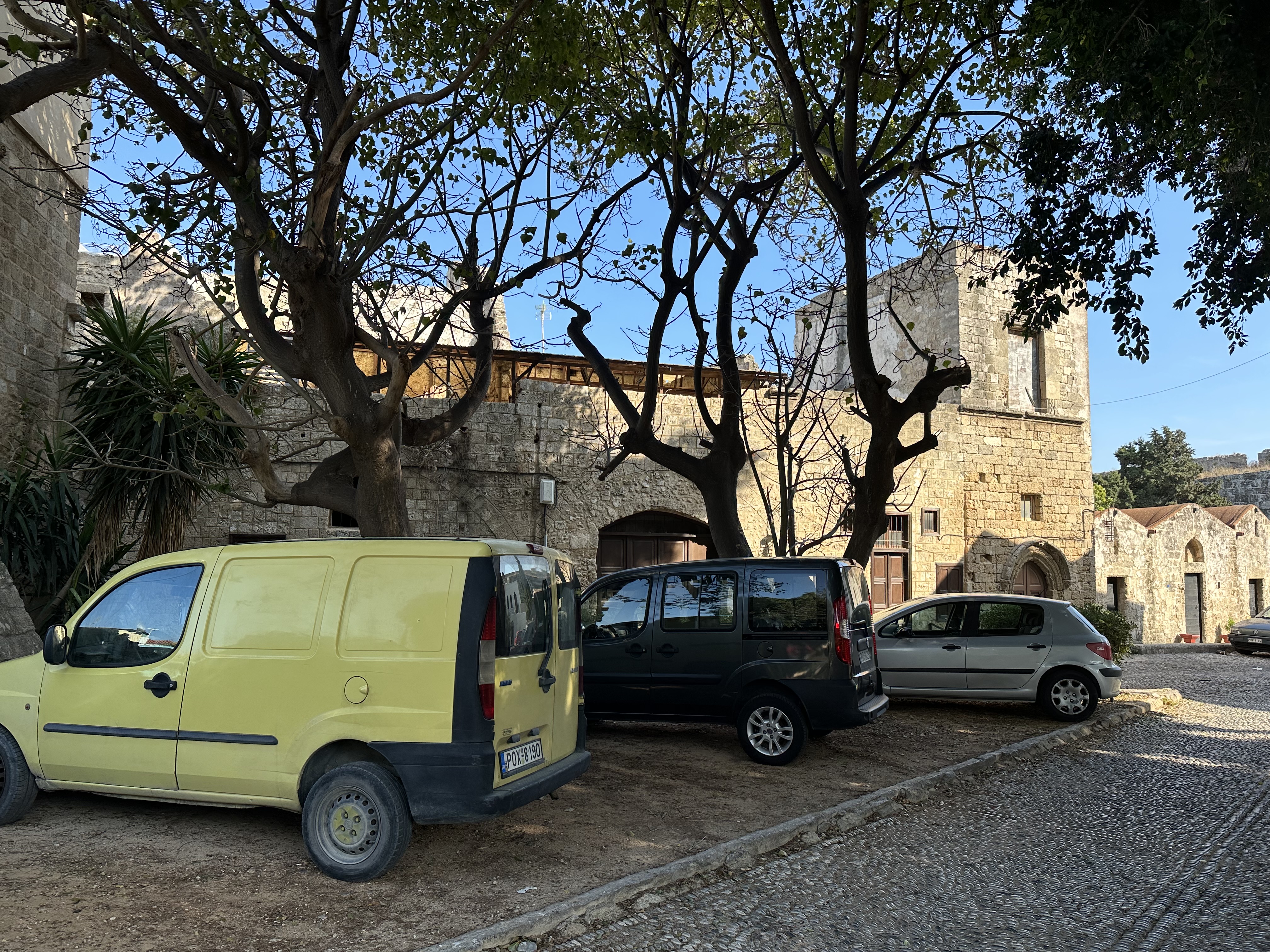We landed in Rhodes well after dark. We hauled our luggage off the ferry, along the Old City wall, through an ancient gate, and along the inside of the wall to our hotel. The medieval city is a UNESCO World Heritage site.