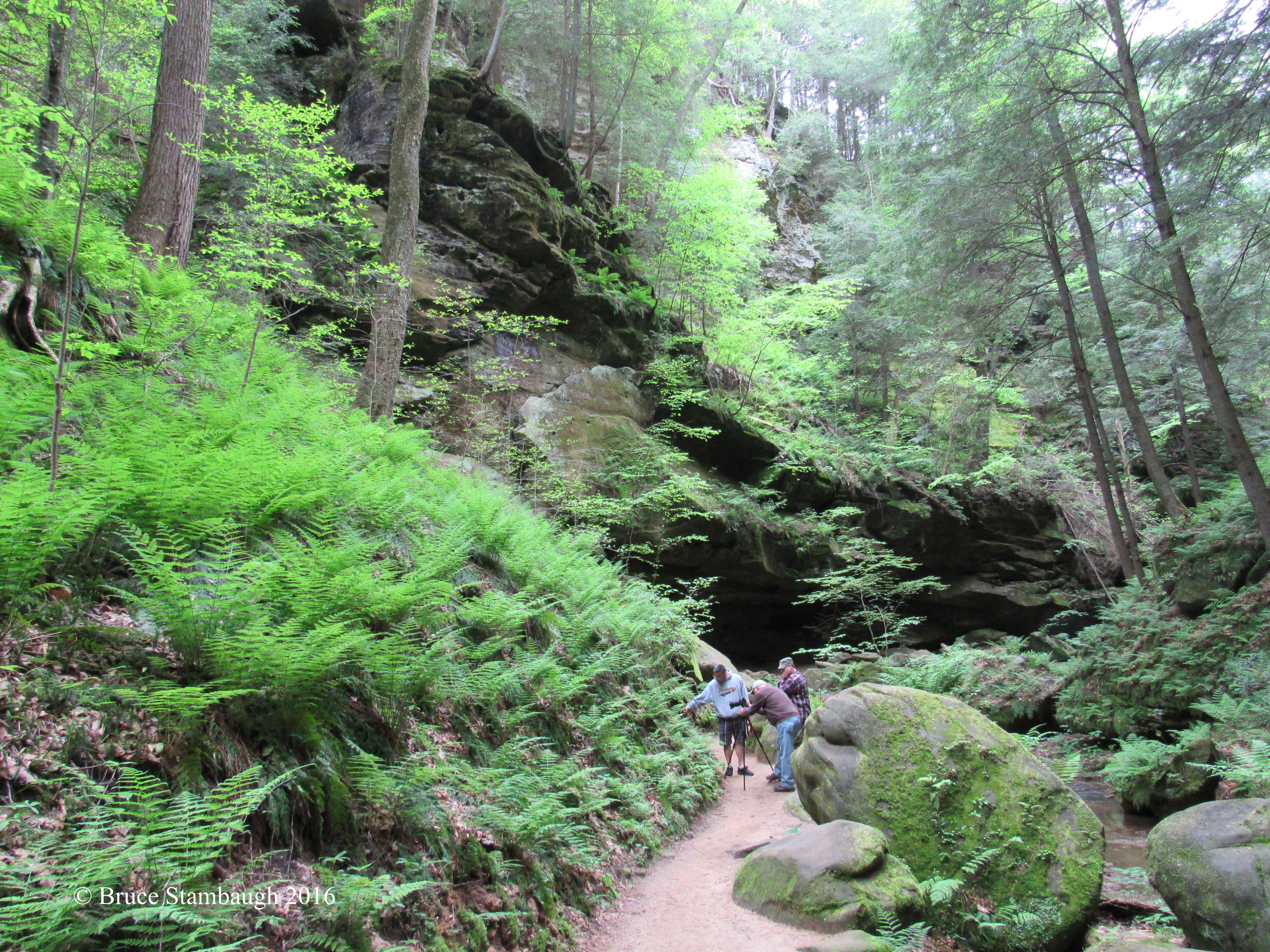 On a recent visit to Hocking Hills State Park, Logan, OH, the many shades of green we encountered astonished us. In this setting in Conkles Hollow, the feathery ferns filled the steep hill beneath massive rock outcroppings and towering cedars and deciduous trees with leaves unfurling. The mosses and lichens added to the natural green pallet as a trio of men did a photoshoot of their own.