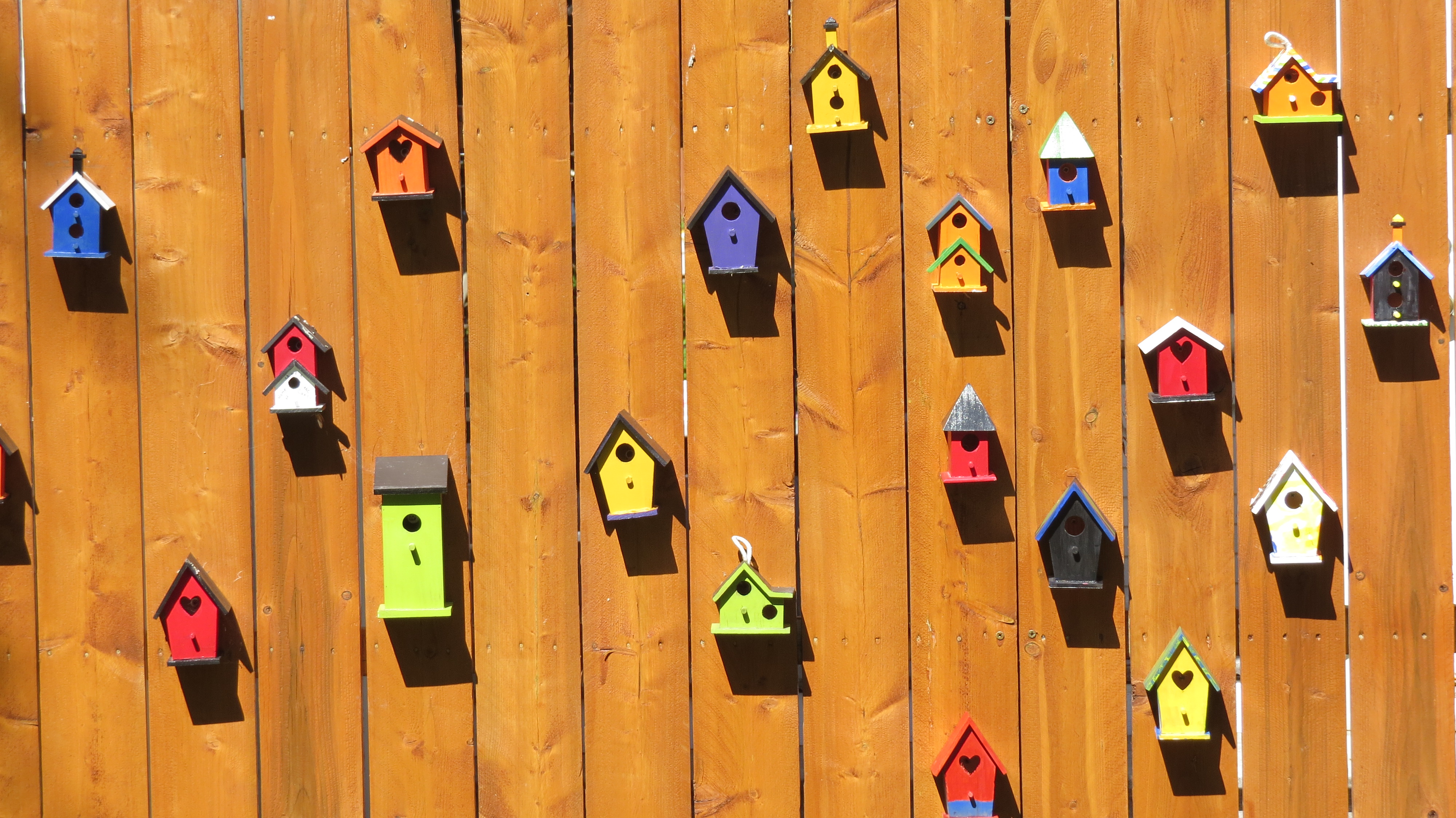 This decorative arrangement of birdhouses on this backyard fence in Lakeside, Ohio really caught my eye. My wife and I were on a tour of various cottages in the quaint Chautauqua town. As we exited a cottage into the backyard, the sun beautifully illuminated this eye-catching display.