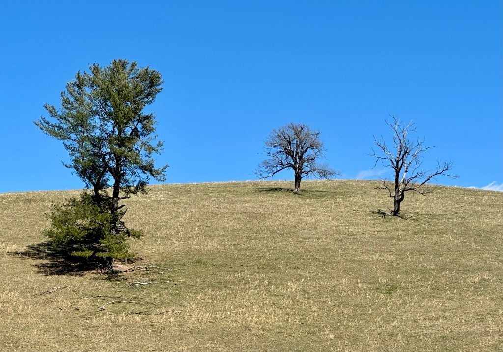 At the top of the ridge, some of the birders broke off to return home or head to their workplace. The rest of us walked on, admiring the varying landscape, vegetation, and mix of deciduous and evergreen trees.