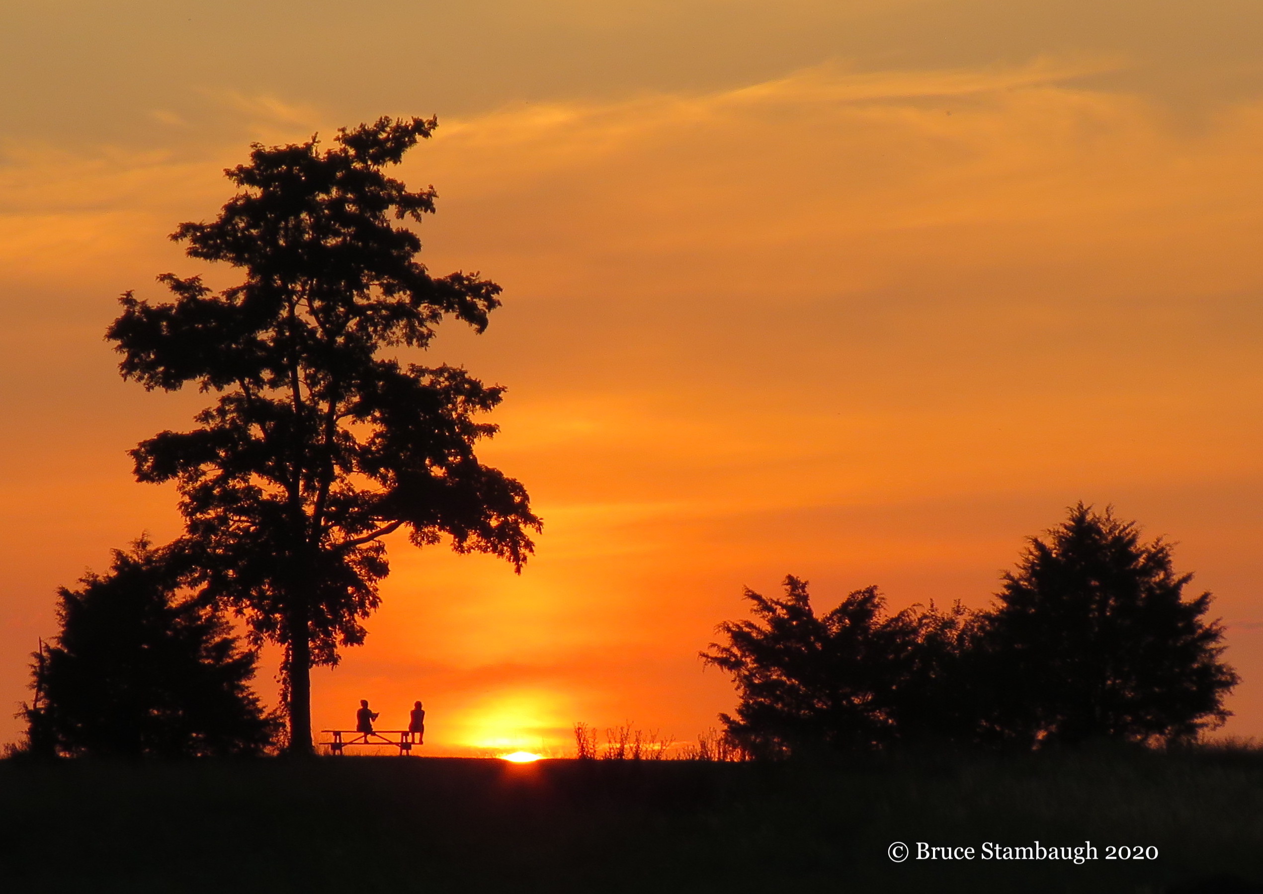 Sometimes a photogenic scene comes to you. In a way, that’s what happened in this photo. I was watching my grandchildren swim on a recent summer evening when the western sky caught my attention. With other adults present, I excused myself and walked to the only open spot on the property. The sky was rapidly turning orange with the sun nearing the tip of the Allegheny Mountains, which were beyond the little ridge before me.