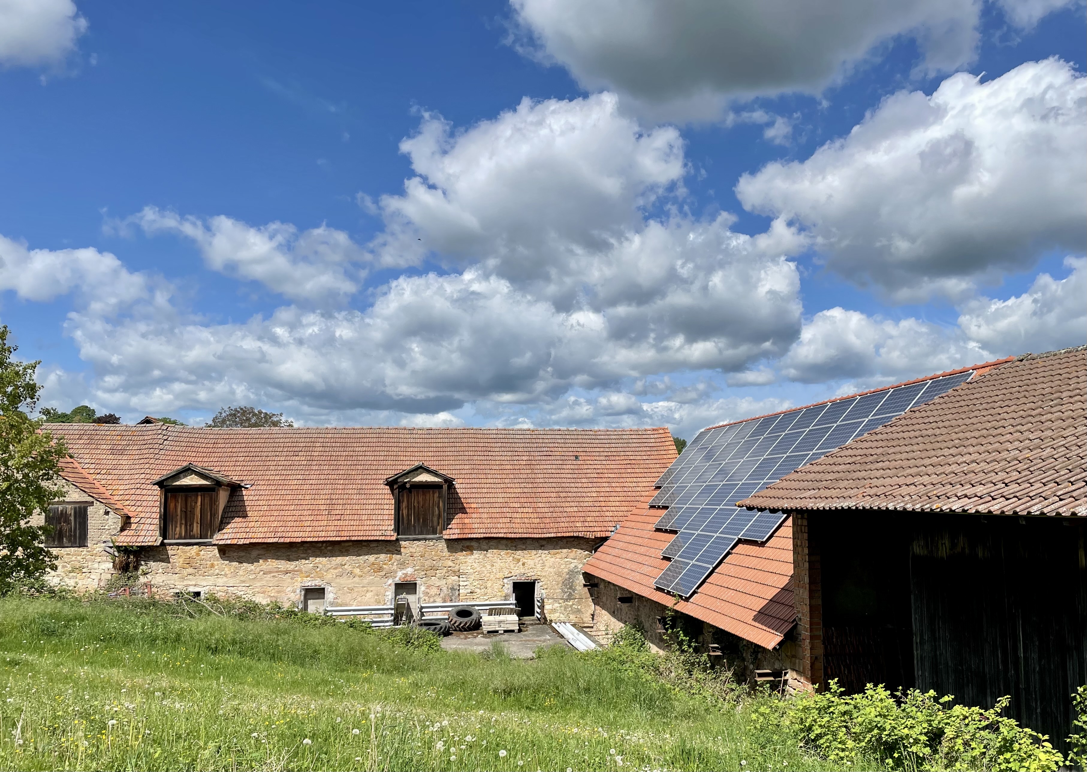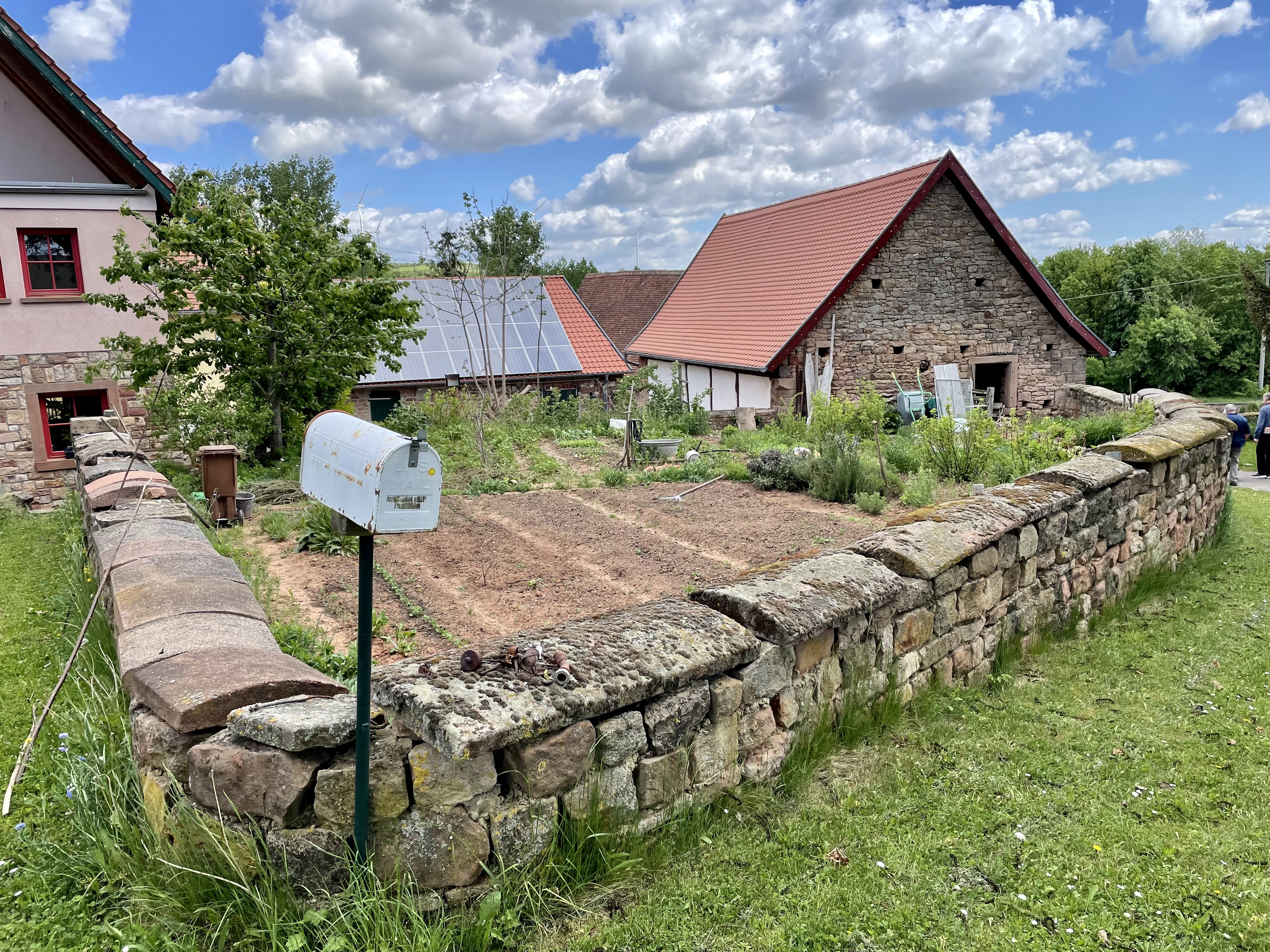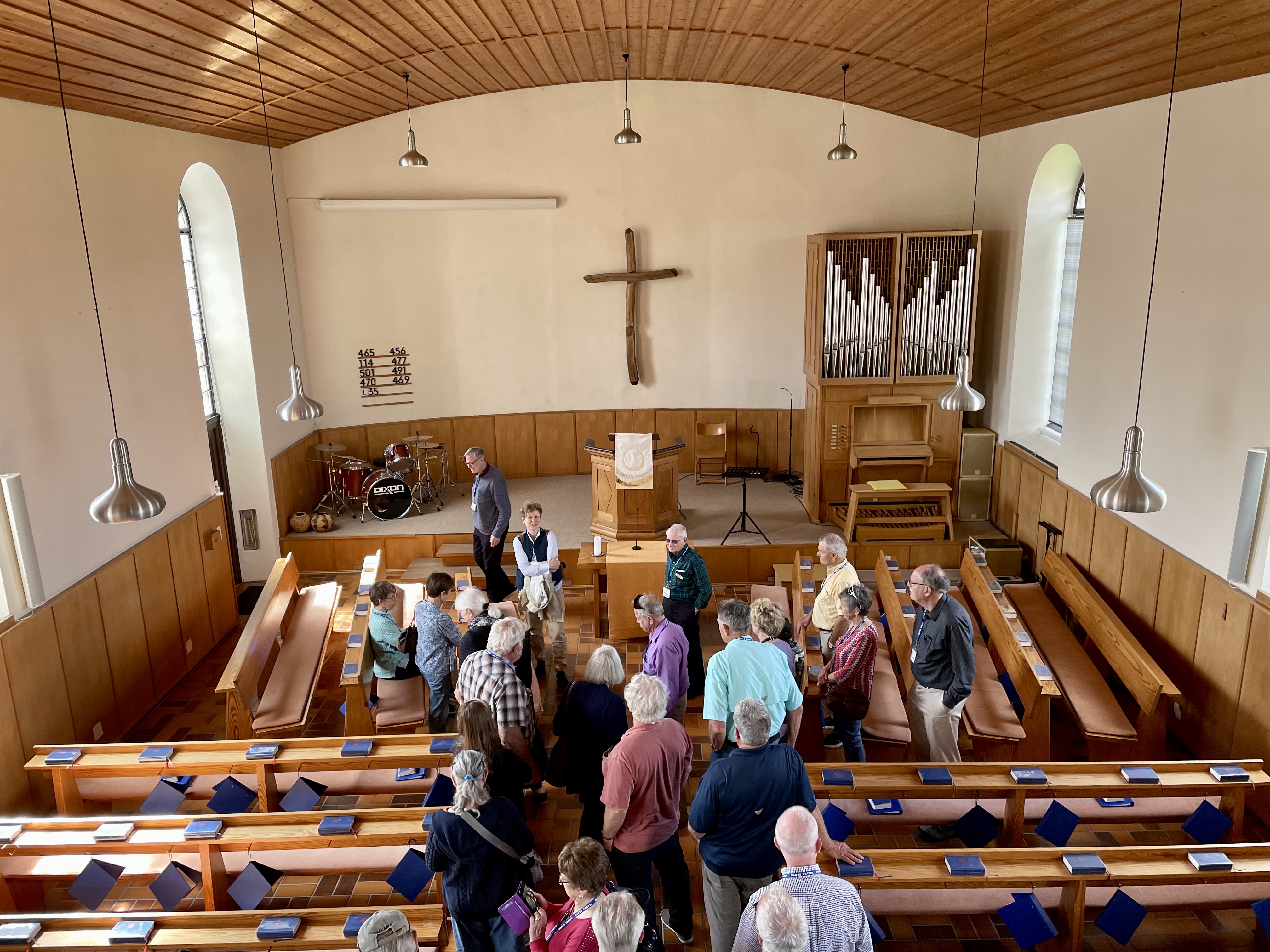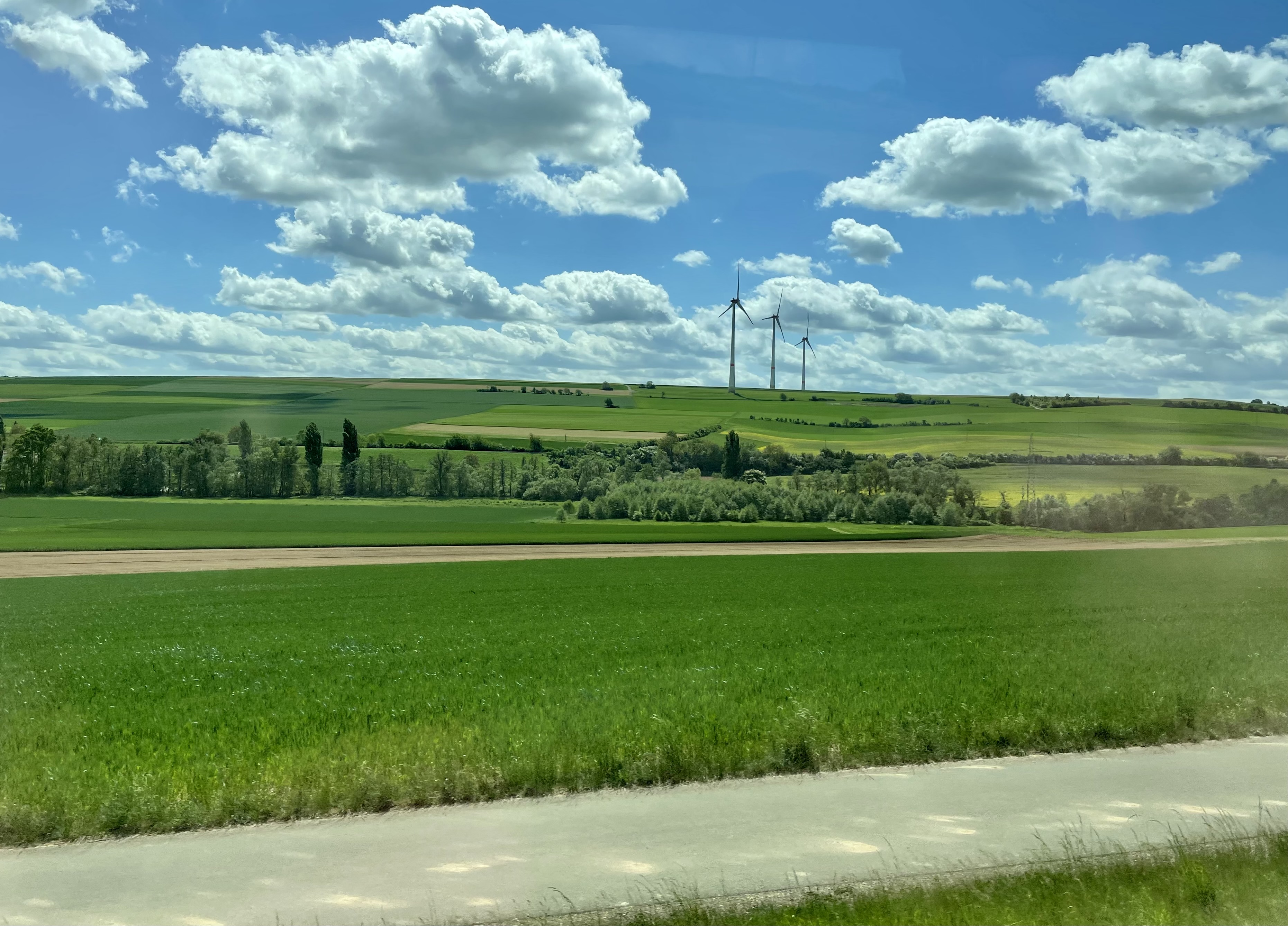 The photos above were all taken at our first stop, Weierhof, an early Anabaptist settlement. The images show a little free library; solar panels on an old farmstead; the Weierhof Mennonite Church; a walled garden, and the rolling German countryside with bike paths, farm fields, and windmills.