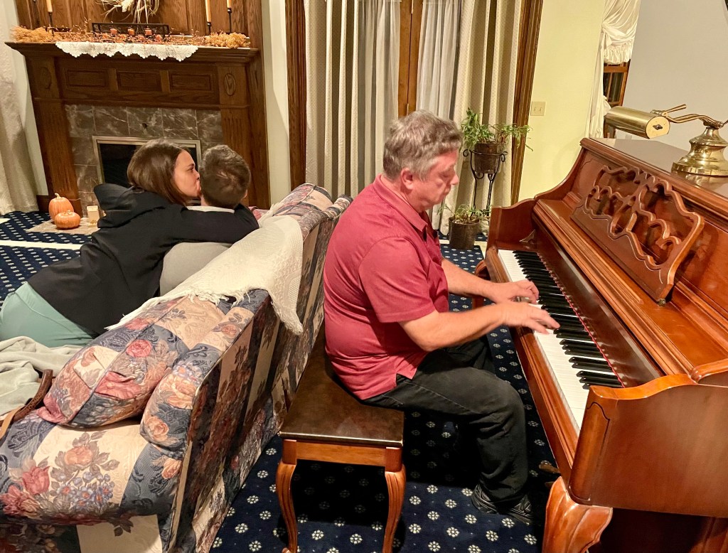 The guy playing the piano really is a preacher. Larry is my wife’s first cousin, and while he played a church hymn, our niece planted a loving kiss on her husband’s cheek. The couple had driven down to surprise us at a long-delayed family reunion. I really went to capture Larry in action when Rachel created a cute diversion worth sharing.