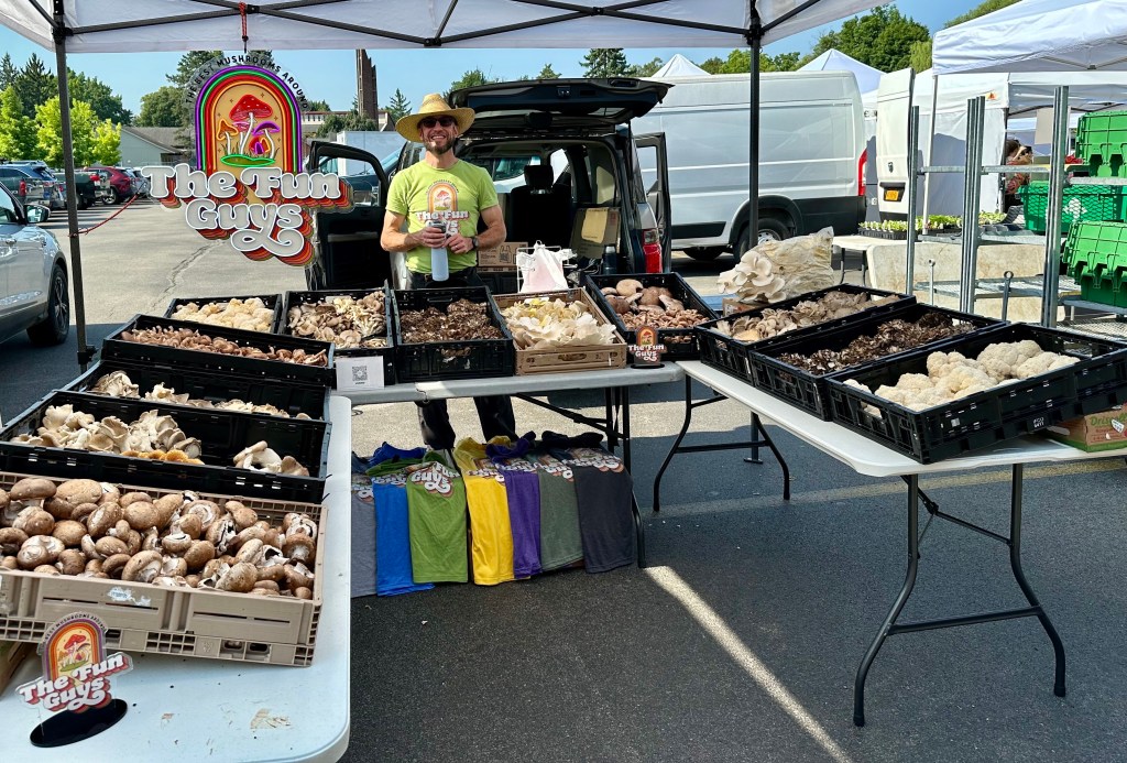 A mushroom merchant’s booth at a Farmers Market. Photo by Bruce Stambaugh