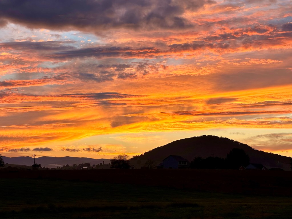 I wasn’t too hopeful for a glowing sunset, yet when I looked out, the sky radiated orange across the western sky. I knew my only chance for a photo was from the middle of the street in front of our home. So, I did that, standing at nearly the same spot as the morning photo of Mole Hill.