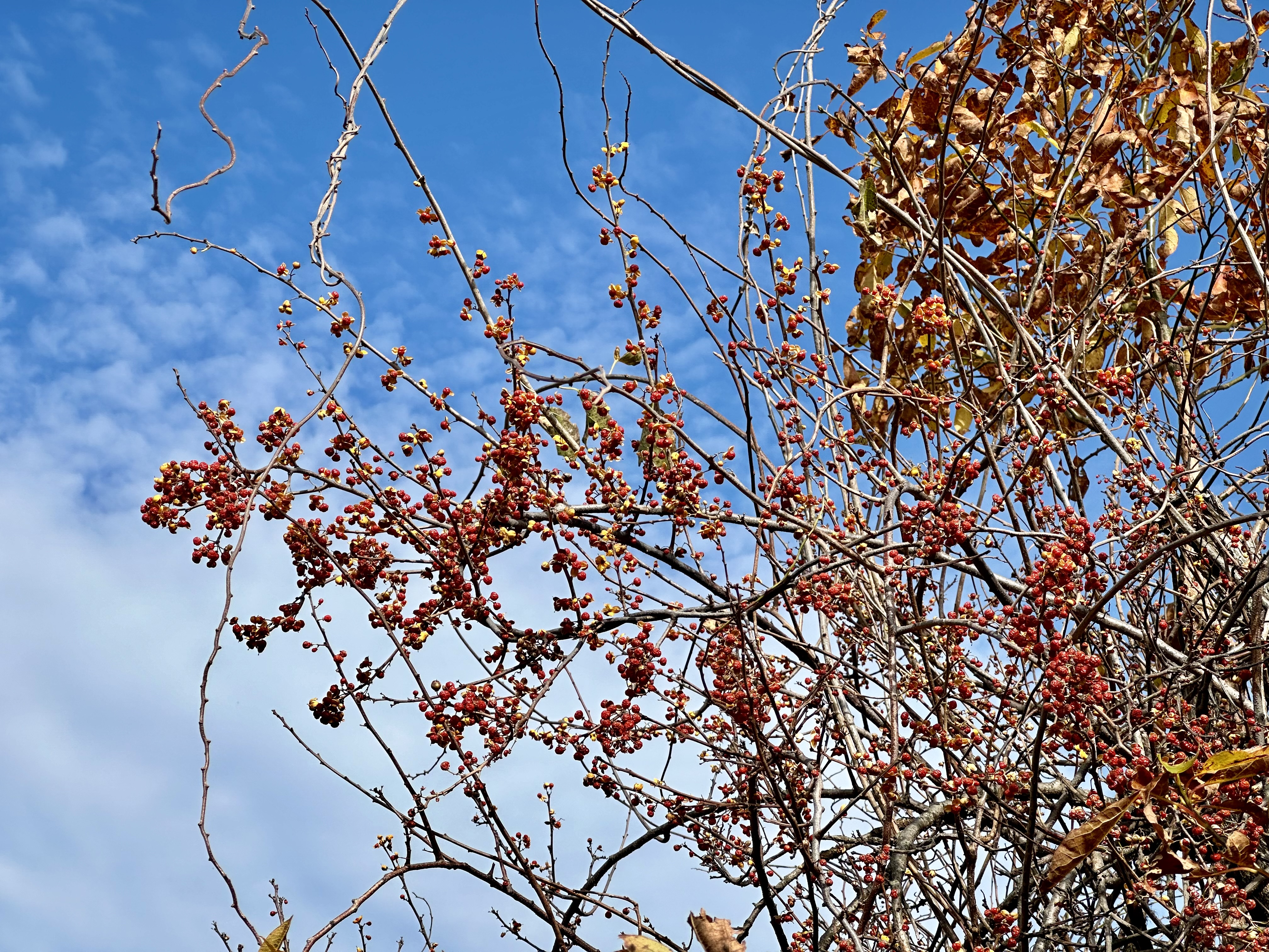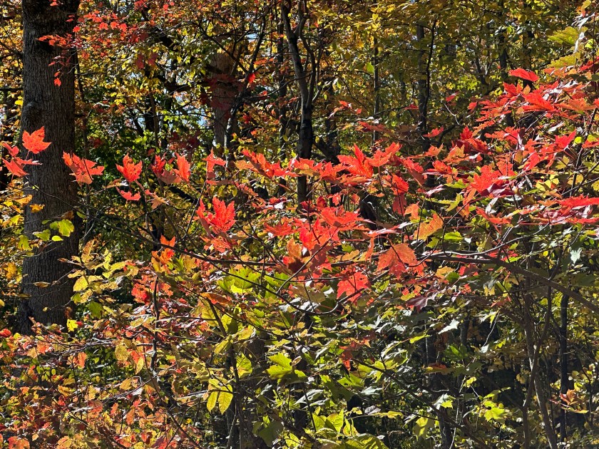A tube feeder that holds a pound of black-oil sunflower seeds hangs from a limb on the west side of the front yard red maple tree. A suet feeder filled with peanut butter suet dangles from a limb on the east side of the tree. I scatter clean, cracked corn and safflower seeds below them.