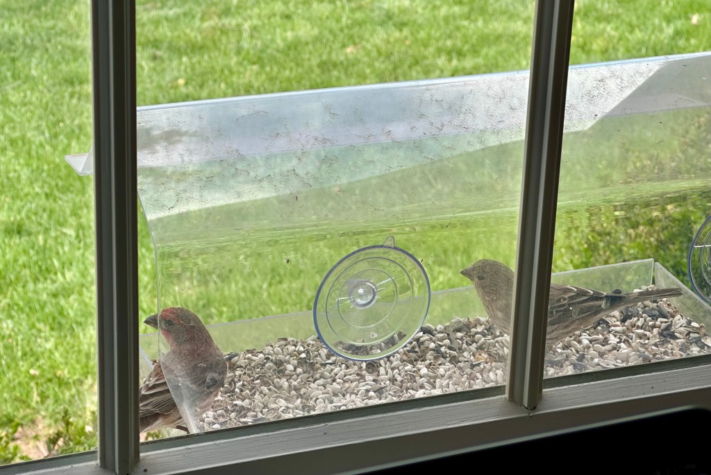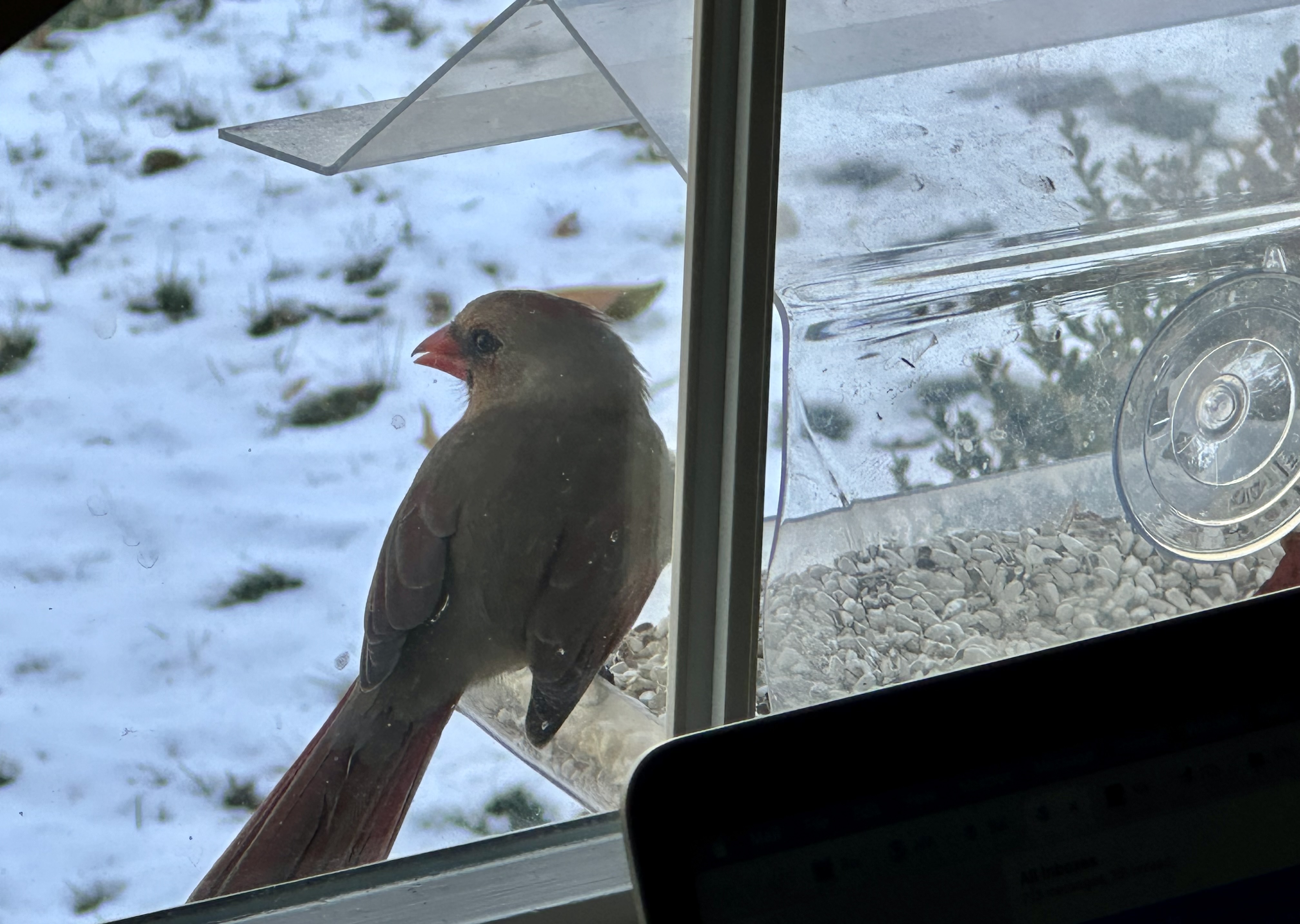 The fourth feeder is suctioned to the window in front of my desk. It’s filled with safflower seeds, which only a few birds will eat. Fortunately, safflower seeds are a second-choice food for Northern Cardinals, which seem to have no fear if I’m at my computer on the inside of the window. If I move too quickly, however, they quickly scatter.