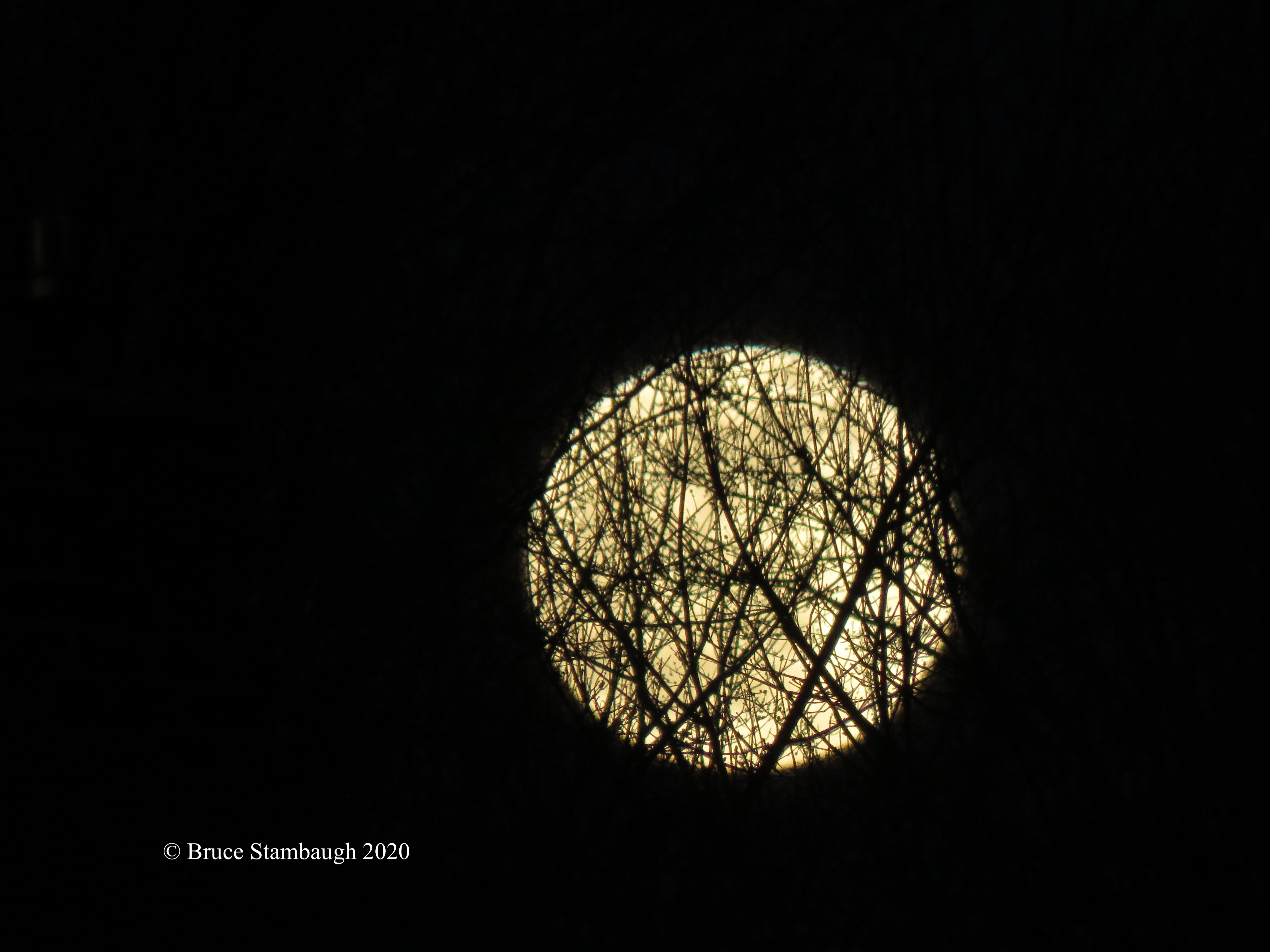 Though this might resemble a nearly empty ball of yarn, it’s actually December’s full moon rising behind some trees. I’m posting this as a reminder to watch for tonight’s Wolf Full Moon. Hopefully, it will be clear where you live so you can enjoy its splendor without any obstructions.