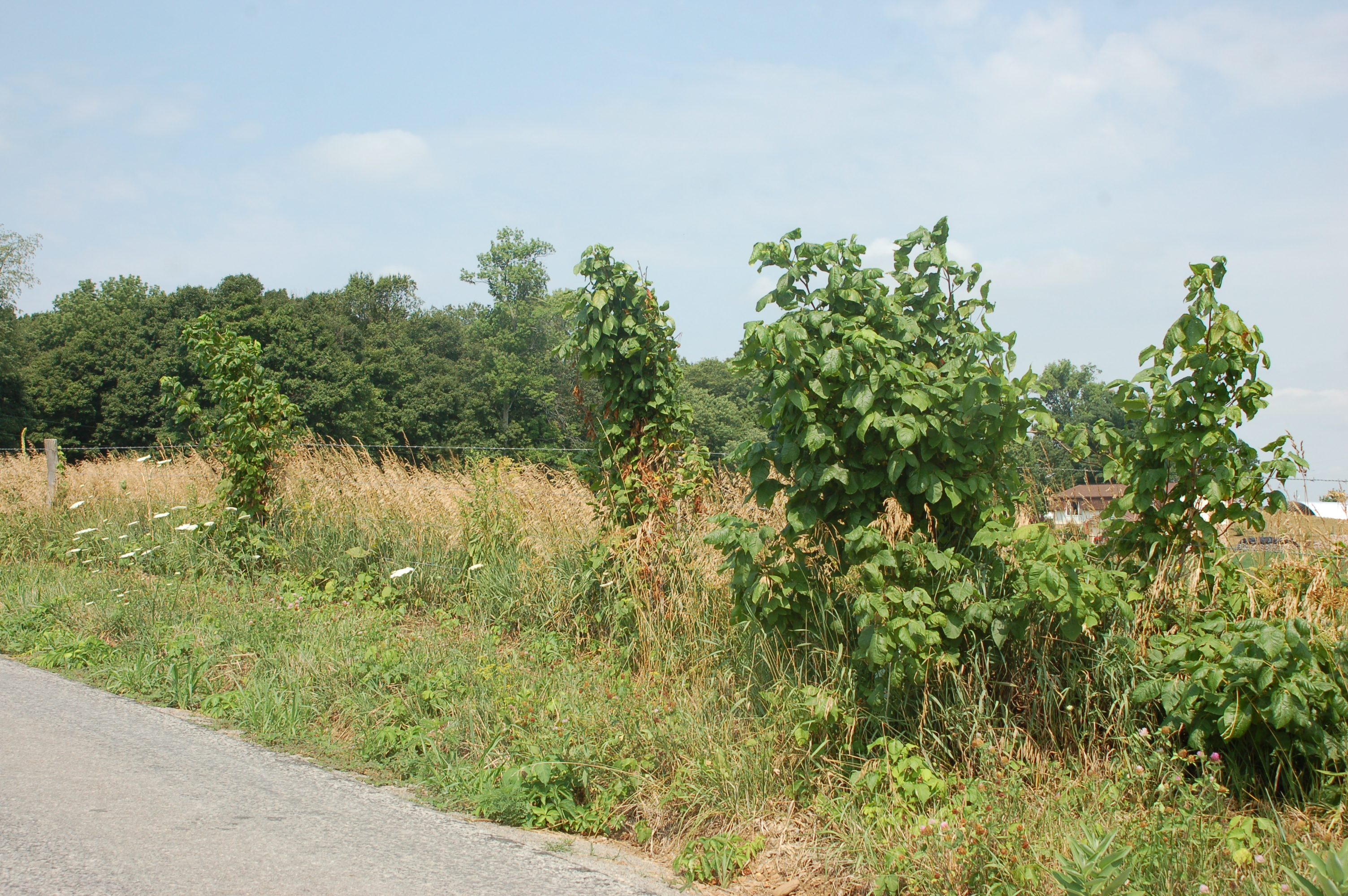 Poison ivy vines have over run many of the locust fence posts along the roadway.