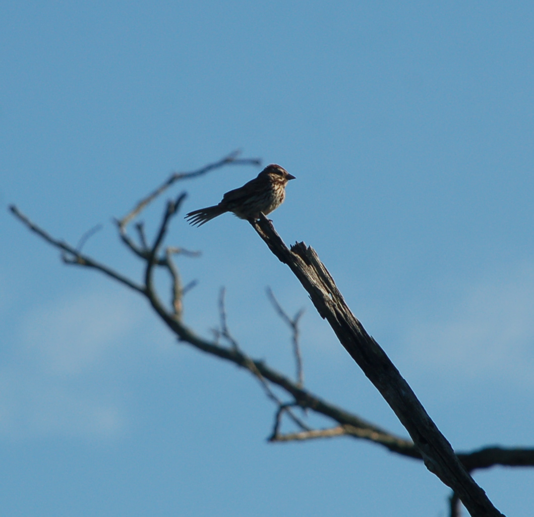 One of several Song Sparrows that I see on my walk.The American Robins and Song Sparrows are all used to me by now, and keep on singing in place. A young flicker, still with no brilliant red on the back of its head, flits from fence post to tree to utility pole. Poison ivy vines, leaves shiny as Christmas holly, have nearly over grown every locust post. A Green Heron escorts me back up the incline until it settles atop the tallest tree in a dense woodlot.