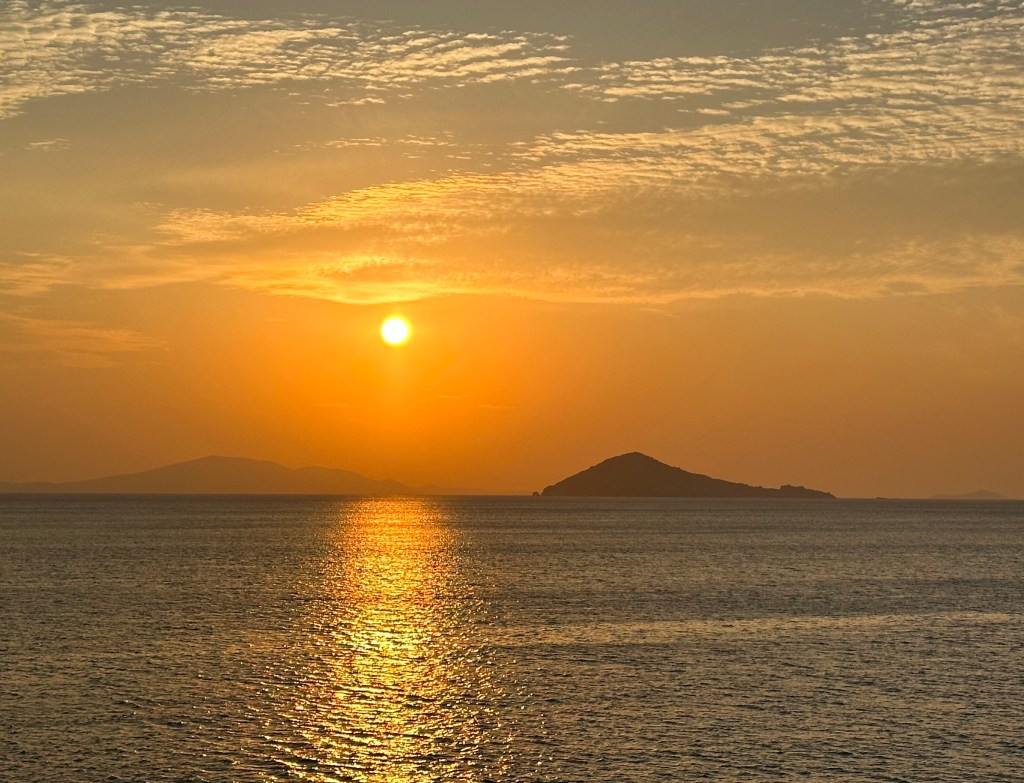 The rises sun over Turkey as seen from a Greek island. Photo by Bruce Stambaugh