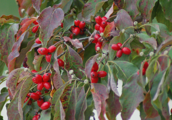 In my own yard, silky green to purplish dogwood leaves accentuated the trees’ bold, bright red berries. The backyard birds weren’t too pleased with me for disturbing their feasting.