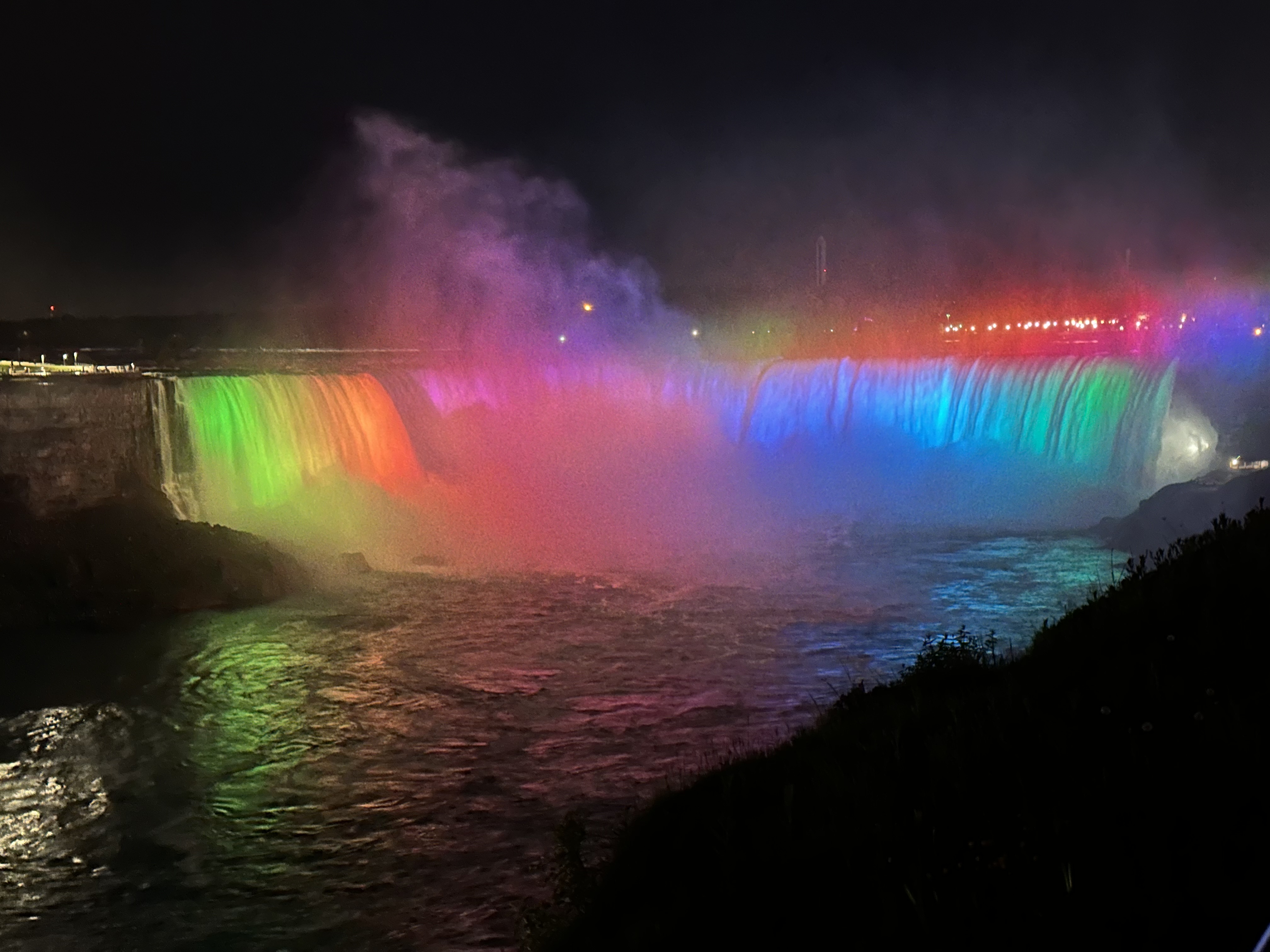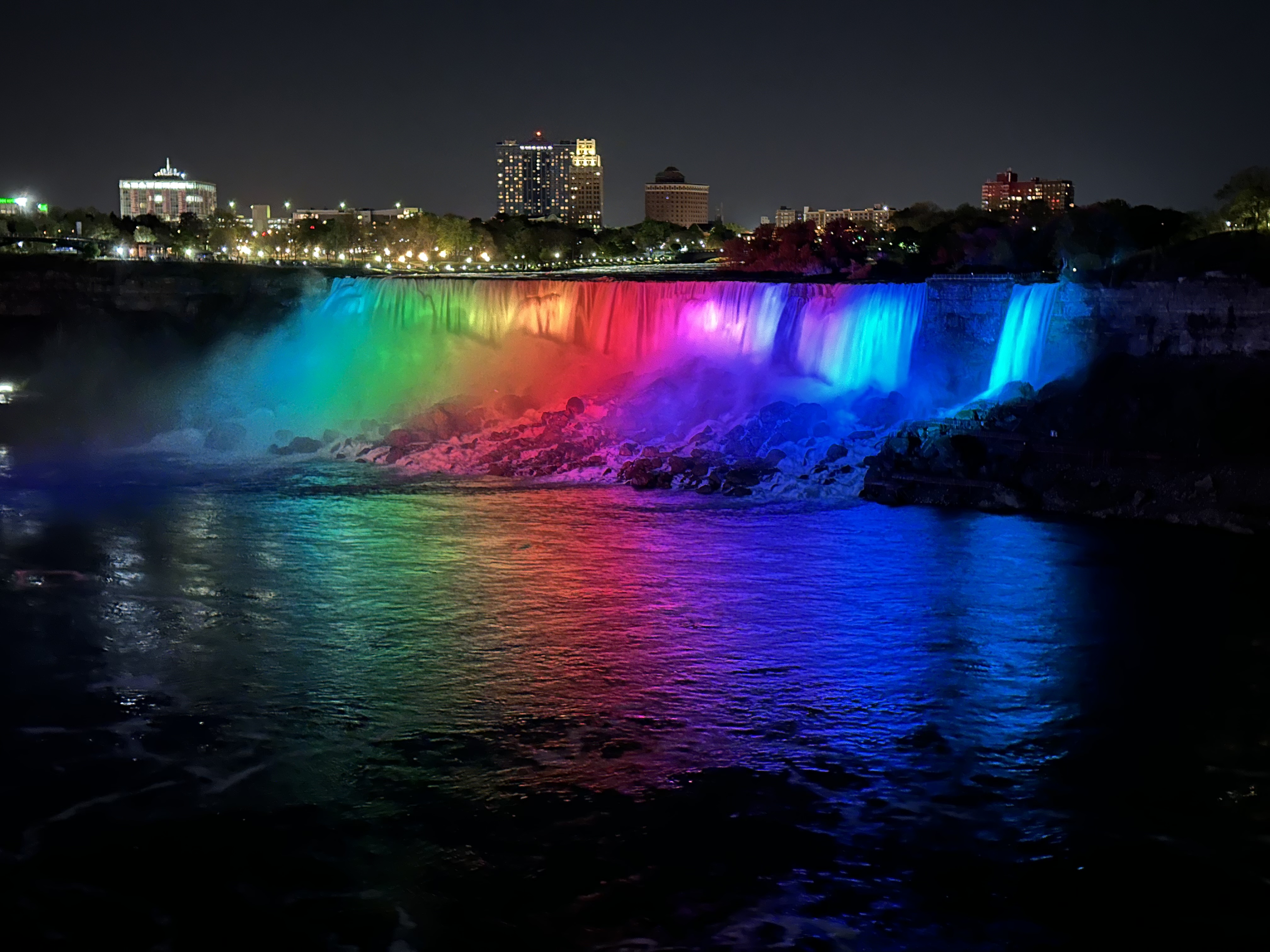 At exactly 9:30 p.m., we got a pleasant surprise. A colorful fireworks show lit the night sky on the Canadian side directly across from the American Falls. As soon as they finished, the lights changed to vivid colors that kept changing from gaudy green to brilliant blue to the ripest red.