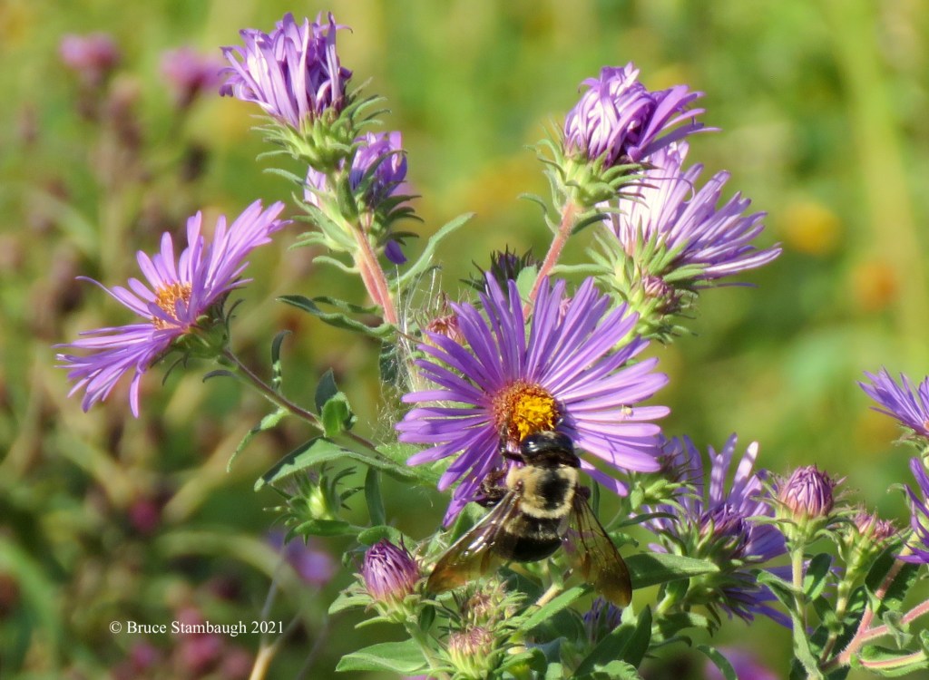 This bumblebee worked these lovely New England Aster blossoms for all they were worth. When I cropped the photo, I realized that the bumblebee had a spectator. On one of the flower’s petals to the right of the pollinator is a small, greenish spider. Perhaps it was the owner of the web behind the blossom.