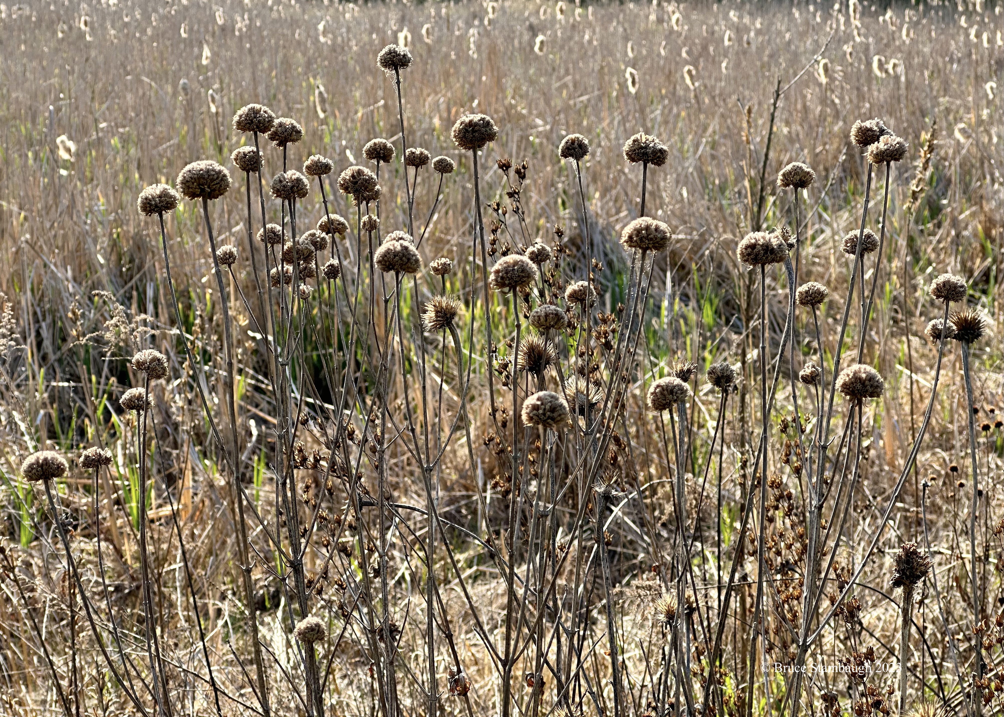 The cones of last summer’s Black-eyed Susans stand naked before fluffy cattails.