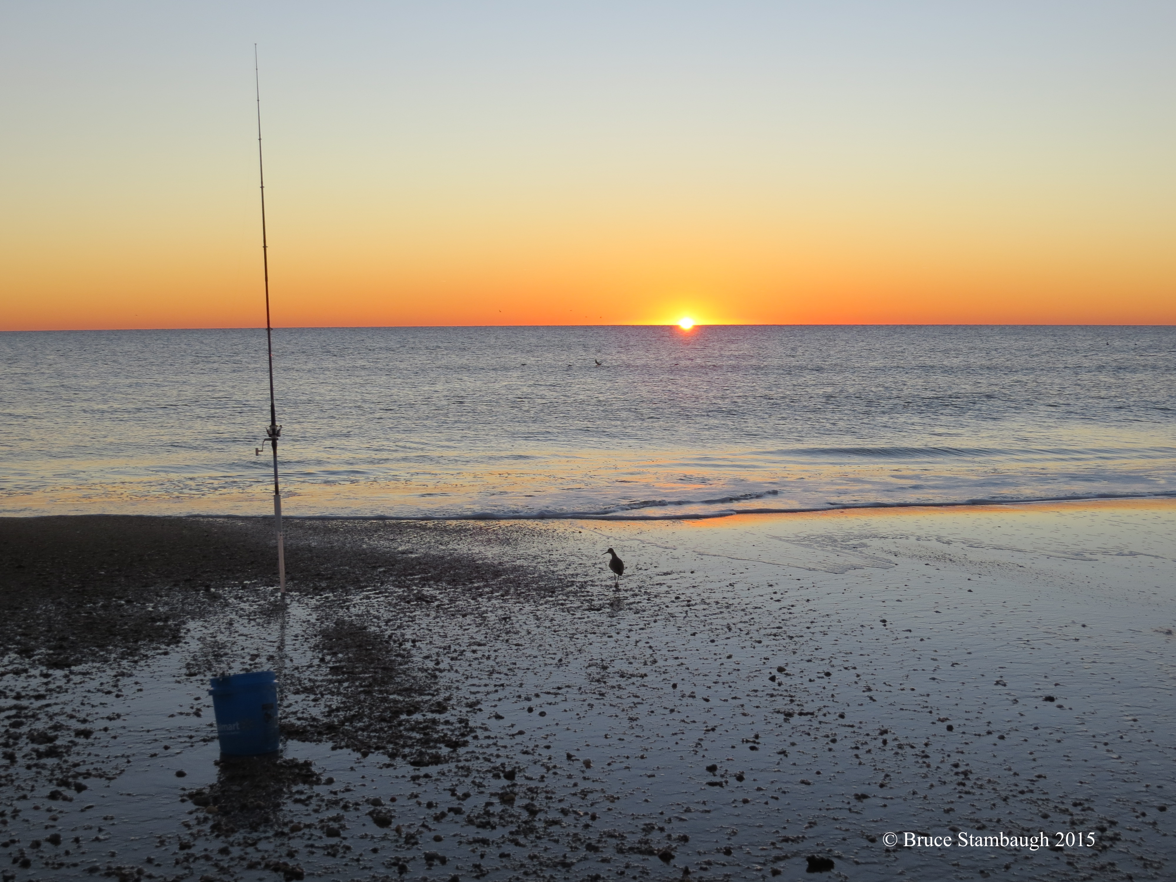 I doubt that the line on this fisherman’s pole would reach the horizon. But I thought the combination of the bait bucket, pole, and the photo bomb by the Willet and the Black Skimmers made an interesting composition to a recent sunrise on Main Beach, Fernandina Beach, FL.